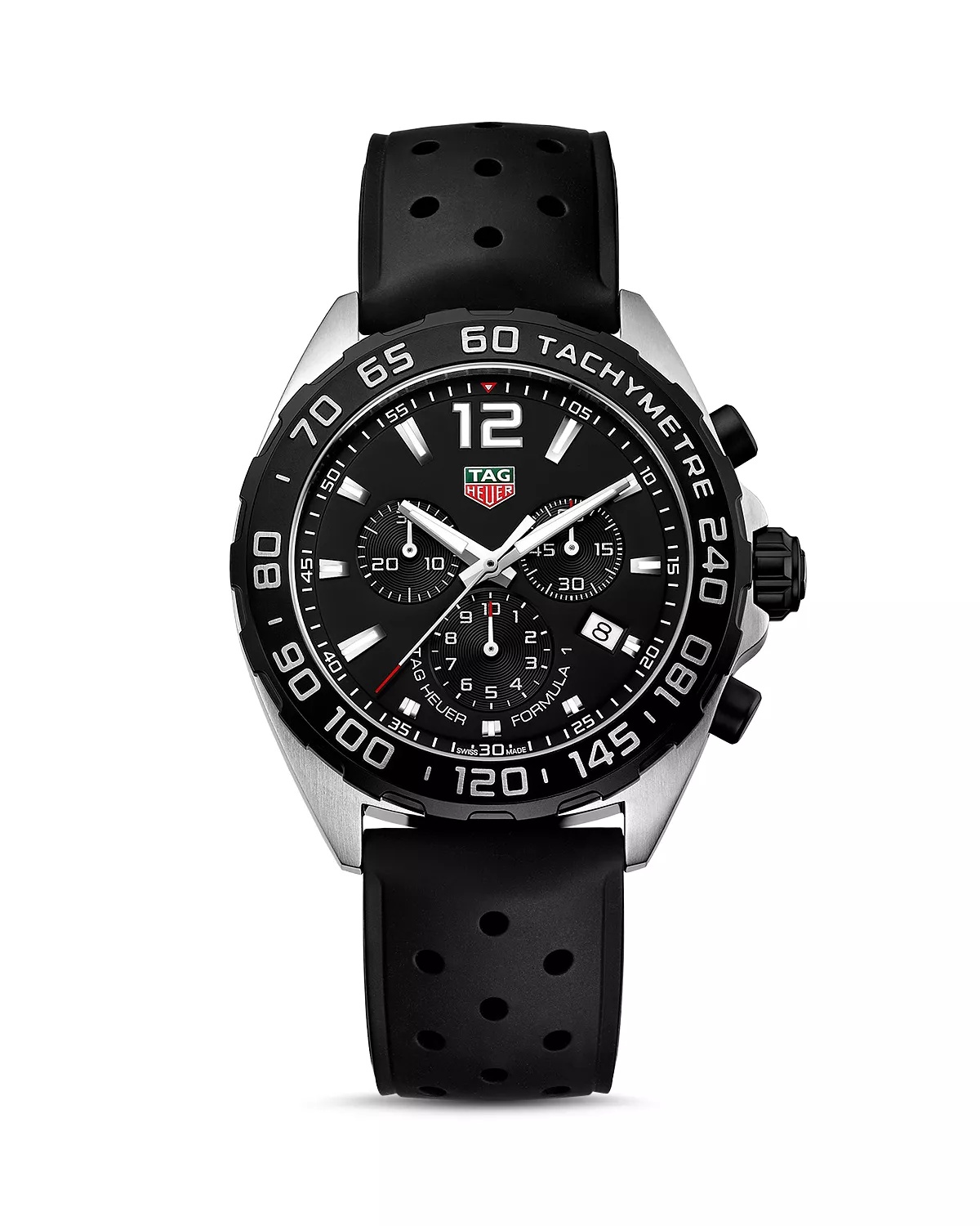 SIZE & FIT - In 1860, Edouard Heuer started designing timepieces in Saint-Imier, Switzerland at the age of 20. The crown-operated, keyless winding system was his first patent, - which changed the course of watchmaking history. Continuing his pioneering legacy, the Swiss luxury brand has gone on to introduce numerous innovative patents - and timeless designs, deeming it one of the most advanced and luxurious watchmakers in the world. PRODUCT DETAILS - A watch with the power and precision of a Formula 1 race car, this 43mm chronograph is for the perfection-driven - Tarmac-black dial has three counters, measuring permanent seconds, hours, minutes and 1/10ths of a second - Tachymeter scale on the bezel enables ultra-accurate distance and speed readings - "Easy grip" pushbuttons and steel screw-down crown are designed for no-fuss handling, even with racing gloves on - Stainless steel; rubber; sapphire crystal - Case size: 43mm - Fold-over clasp closure - Water resistant to 20 ATM - Quartz movement - Black dial; date display at 4 o'clock - Perforated rubber strap - Manufacturer's 2-year limited warranty - STYLE #CAZ1010.FT8024 - Photo may have been enlarged and/or enhanced - Made in Switzerland Web ID: 2656942