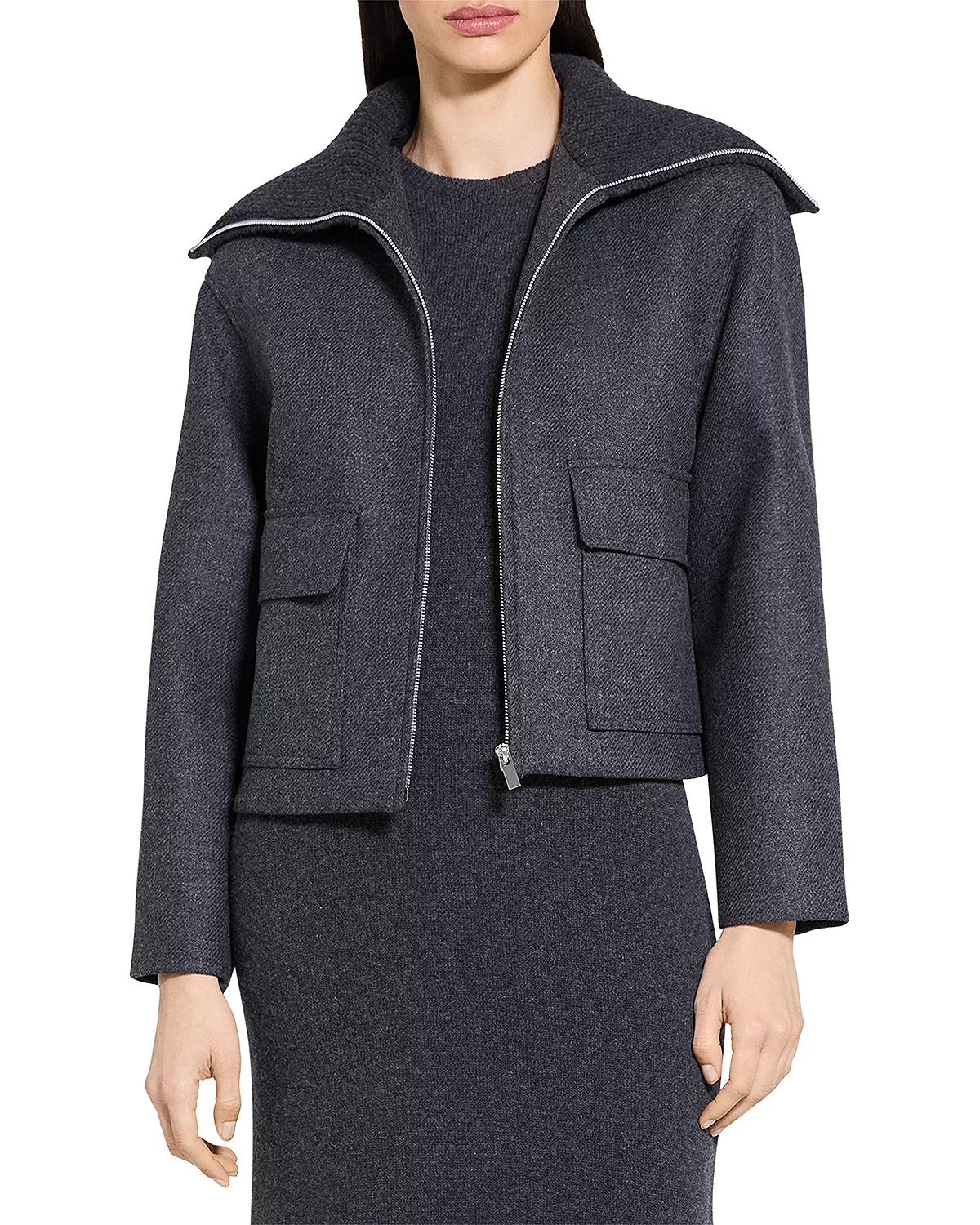 SIZE & FIT - Fits true to size, order your normal size - Approx. 21" length, based on a size small - Model measurements: 5'10" height, 33.5" bust, 23.5" waist, 34.5" hips, wearing a size small PRODUCT DETAILS - Rib-knit foldover funnel collar - Long sleeves - Front two-way zipper closure - Double-entry flap pockets - Lined - Imported Web ID: 5734948 MATERIAL & CARE - Shell: 70% wool/ 29% polyamide/ 1% acrylic lining: 100% polyamide - Dry clean