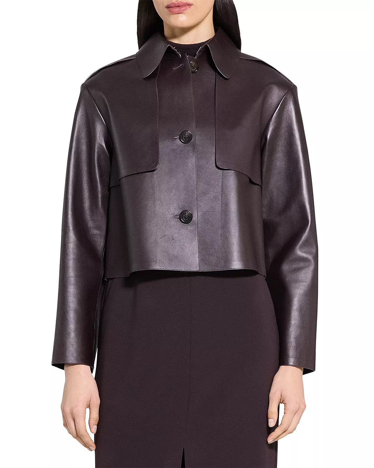 SIZE & FIT - Fits true to size, order your normal size - Designed for a cropped fit - 18" length, based on a size S/4 - Model measurements: 5'10" height, 33.5" bust, 25.5" waist, 34.5" hips, wearing a size PRODUCT DETAILS - Spread collar - Long sleeves - Front button closures - Double storm flaps - Made in India Web ID: 5710552 MATERIAL & CARE - Leather - Professional leather clean