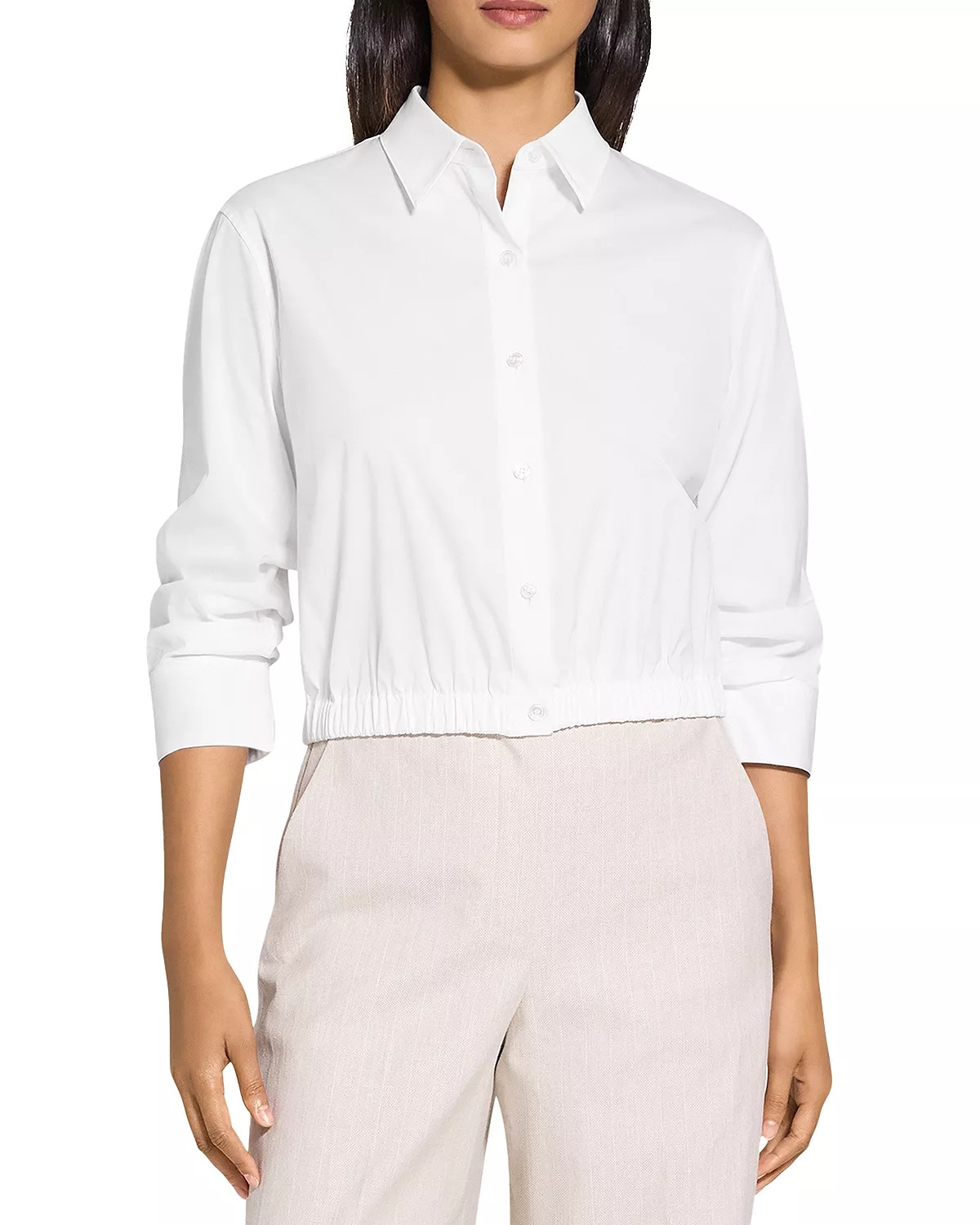 SIZE & FIT - Fits true to size, order your normal size - Approx. 19.13" long - Model measurements: 5'10" height, 33.5" bust, 23.5" waist, 34.5" hips PRODUCT DETAILS - Point collar - Three-quarter length ruched sleeves with button cuffs - Front button closures - Back yoke and box pleat - Cinched hem - Imported Web ID: 5448265 MATERIAL & CARE - Cotton/ nylon/ LYCRA® spandex - Dry clean