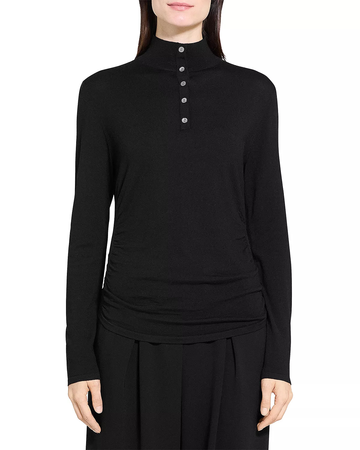 SIZE & FIT - Fits true to size, order your normal size - Designed for a slim fit - 25" length, based on a size small - Model measurements: 5'10" height, 33.5" bust, 25.5" waist, 34.5" hips, wearing a size S/4 PRODUCT DETAILS - Mock neck - Long sleeves - Front button closures - Shirred detailing at side seams - Imported Web ID: 5710570 MATERIAL & CARE - Merino wool - Dry clean