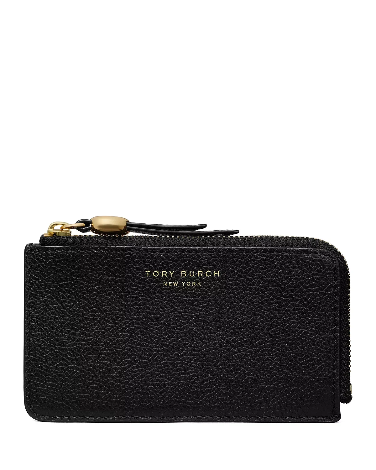 SIZE & FIT - Founded in 2004 in New York City, Tory Burch is an American luxury brand known for timeless pieces and rich storytelling that evokes optimism and joy. Tory is a fashion designer who draws inspiration from her parents' effortless style, the - worlds of travel, art and interiors, and women globally. The Tory Burch collections include ready-to-wear, handbags, footwear, accessories, jewelry, and beauty. Empowering women is the company's guiding principle, underpinning the design - philosophy and company culture, and driving the work of the Tory Burch Foundation. PRODUCT DETAILS - Dimensions: 5.1"W x 0.2"D x 2.8"H - Zip closure - Four exterior card slots & zip pocket - Logo on front - Lined - Main: leather; lining: 100% polyester - Imported Web ID: 5899587
