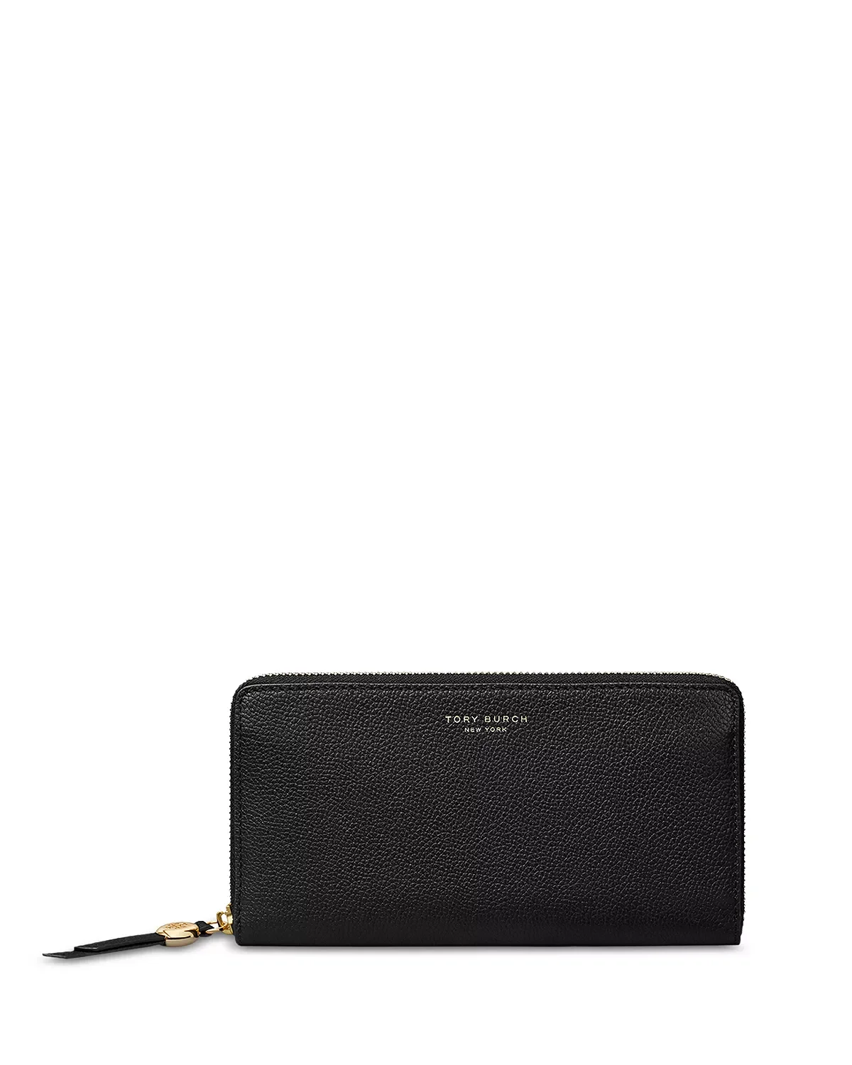 SIZE & FIT - Founded in 2004 in New York City, Tory Burch is an American luxury brand known for timeless pieces and rich storytelling that evokes optimism and joy. Tory is a fashion designer who draws inspiration from her parents' effortless style, the - worlds of travel, art and interiors, and women globally. The Tory Burch collections include ready-to-wear, handbags, footwear, accessories, jewelry, and beauty. Empowering women is the company's guiding principle, underpinning the design - philosophy and company culture, and driving the work of the Tory Burch Foundation. PRODUCT DETAILS - Dimensions: 7.6"W x 4"H - Zip closure - Interior center zip divider, eight card pockets, two bill pockets - Logo on front - Lined - Leather; lining: 100% polyester - Imported Web ID: 5841676