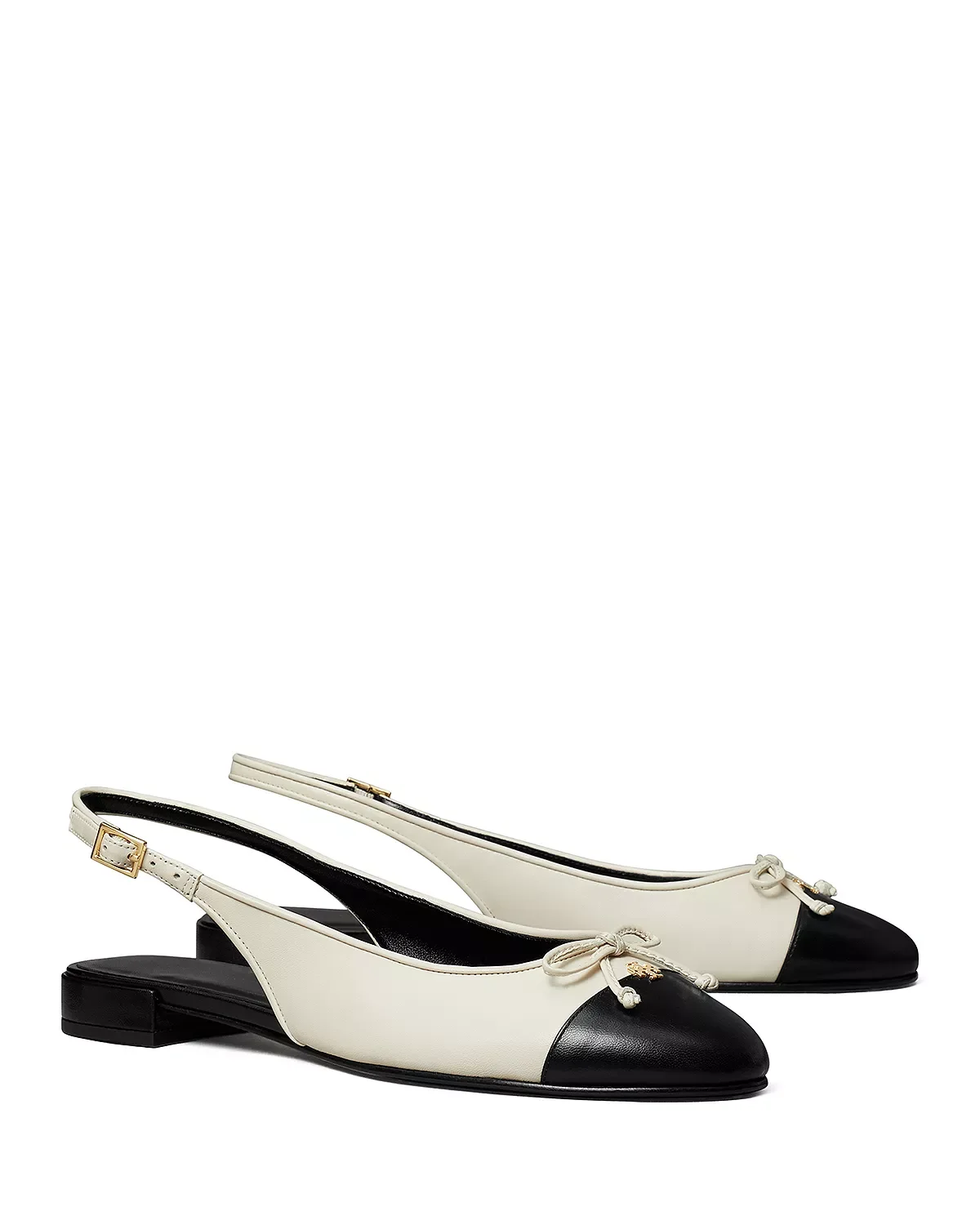 SIZE & FIT - Founded in 2004 in New York City, Tory Burch is an American luxury brand known for timeless pieces and rich storytelling that evokes optimism and joy. Tory is a fashion designer who draws inspiration from her parents' effortless style, the - worlds of travel, art and interiors, and women globally. The Tory Burch collections include ready-to-wear, handbags, footwear, accessories, jewelry, and beauty. Empowering women is the company's guiding principle, underpinning the design - philosophy and company culture, and driving the work of the Tory Burch Foundation. PRODUCT DETAILS - Fits true to size, order your normal size - Round toe - Slingback buckle - Leather upper, lining and sole - Imported Web ID: 5376777