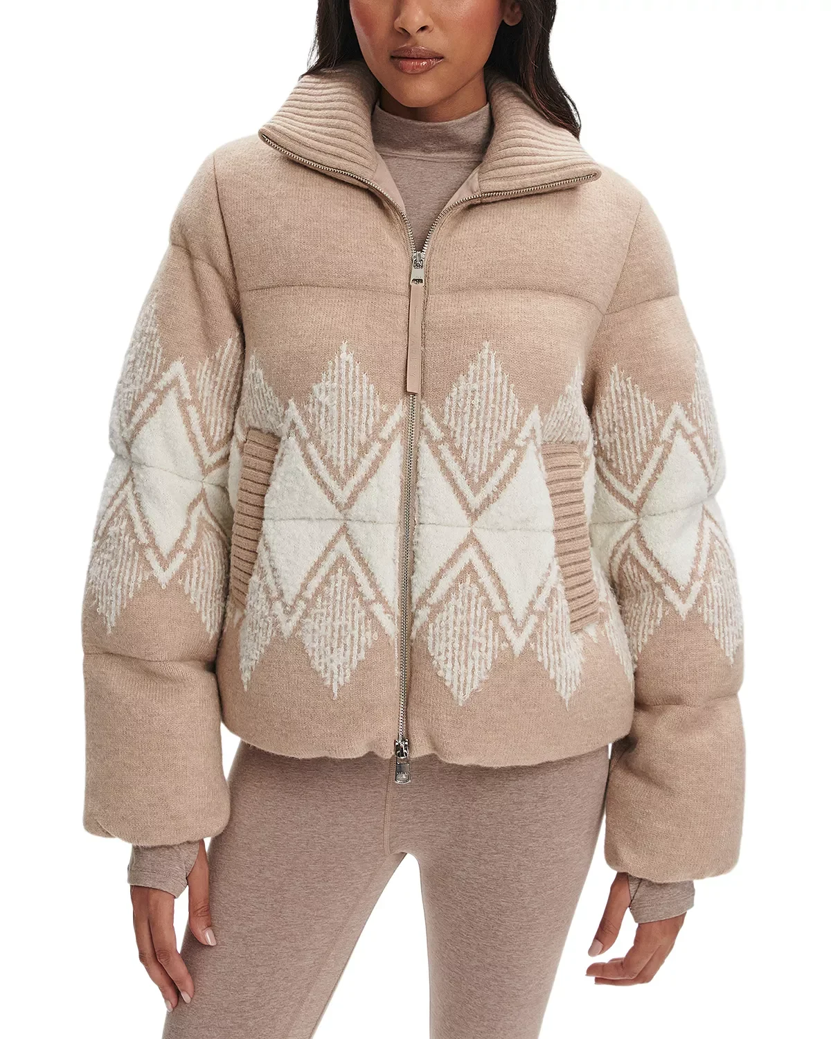 SIZE & FIT - Fits true to size, order your normal size - Designed for an oversized fit PRODUCT DETAILS - Funnel rib-knit collar - Front zip closure - Long sleeves with thumbhole knit cuffs - Sweater-style jacquard knit exterior - Puffer styling - Rib-knit welt hip pockets - Lined - Imported Web ID: 5739224 MATERIAL & CARE - 52% acrylic/25% PBT/14% nylon/5% viscose/4% wool; combo: 64% acrylic/21% nylon/15% wool; fill: 100% polyester - Dry clean