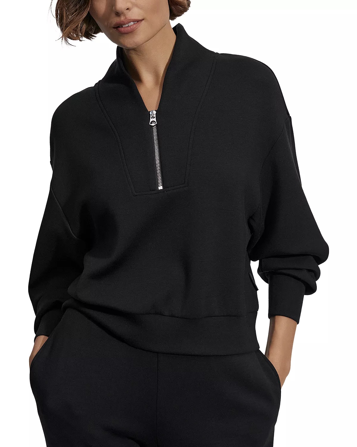 SIZE & FIT - Fits true to size, order your normal size - Model measurements: 5'10" height, 33" bust, 25" waist, 35" hips, wearing a size small PRODUCT DETAILS - Stand collar - Long sleeves - Half-zip closure at front - Imported Web ID: 5043353 MATERIAL & CARE - 72% viscose/23% polyester/5% elastane - Machine wash cold