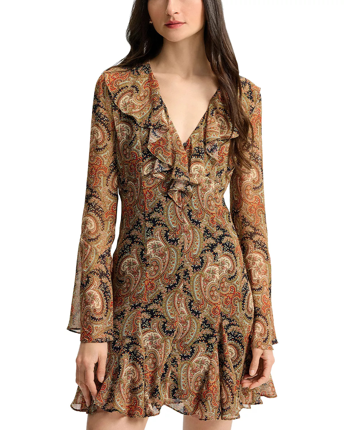 SIZE & FIT - Fits true to size, order your normal size - Designed to hit above the knees - Approx. 34.25" from high point shoulder to hem, 31.25" sleeve length PRODUCT DETAILS - Ruffled V-neck - Long flared sleeves - Allover print - A-line silhouette - Pullover style - Lined - Imported Web ID: 5644482 MATERIAL & CARE - 100% silk; lining: 100% polyester - Dry clean