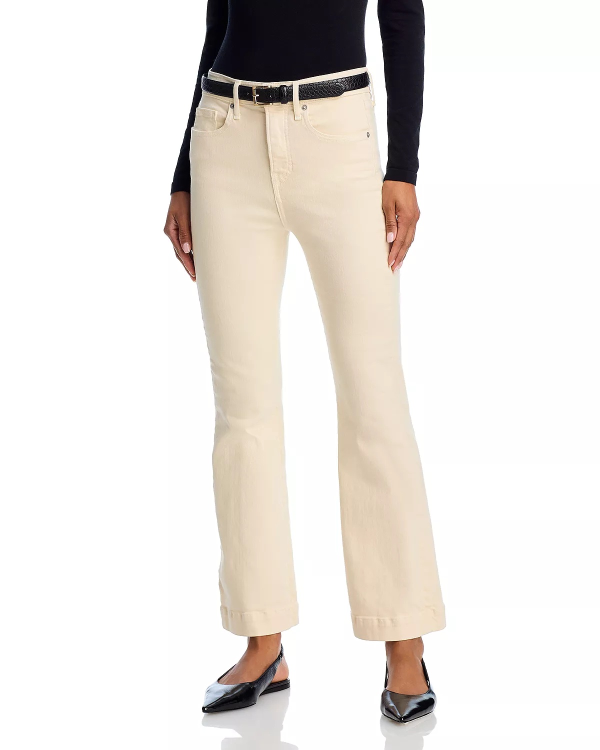 SIZE & FIT - Fits true to size, order your normal size - Rise: 11.25" - Inseam: 28" - Leg opening: 19.5" - All measurements based on a size 26 - Model measurements: 5'10" height, 33.5" bust, 23.5" waist, 34.5" hips, wearing a size 26 PRODUCT DETAILS - Zip fly with button closure, five-pocket silhouette - Tonal stitching, silver-tone hardware, belt loops - Flare-leg silhouette - Made in USA Web ID: 4555175 MATERIAL & CARE - 91% cotton/7% polyester/2% polyurethane - Dry clean