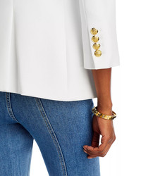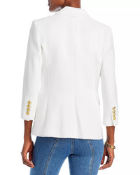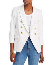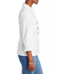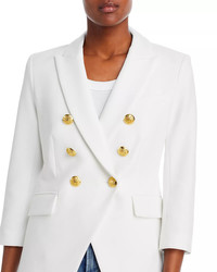 SIZE & FIT - Fits true to size, order your normal size - 25" from shoulder to hem, based on a size small - Model measurements: 5'10" height, 33.5" bust, 23.5" waist, 34.5" hips, wearing a size small PRODUCT DETAILS - Notched lapels - Long sleeves - Front double-breasted button closures, gold-tone buttons - Two flap pockets - Asymmetric front - Lined - Made in USA of Imported Materials Web ID: 4604670 MATERIAL & CARE - Self: 63% polyester, 27% viscose, 7% cotton, 3% elastane. Lining 1: 100% polyester. Lining 2: 96% polyester, 4% elastane - Dry clean