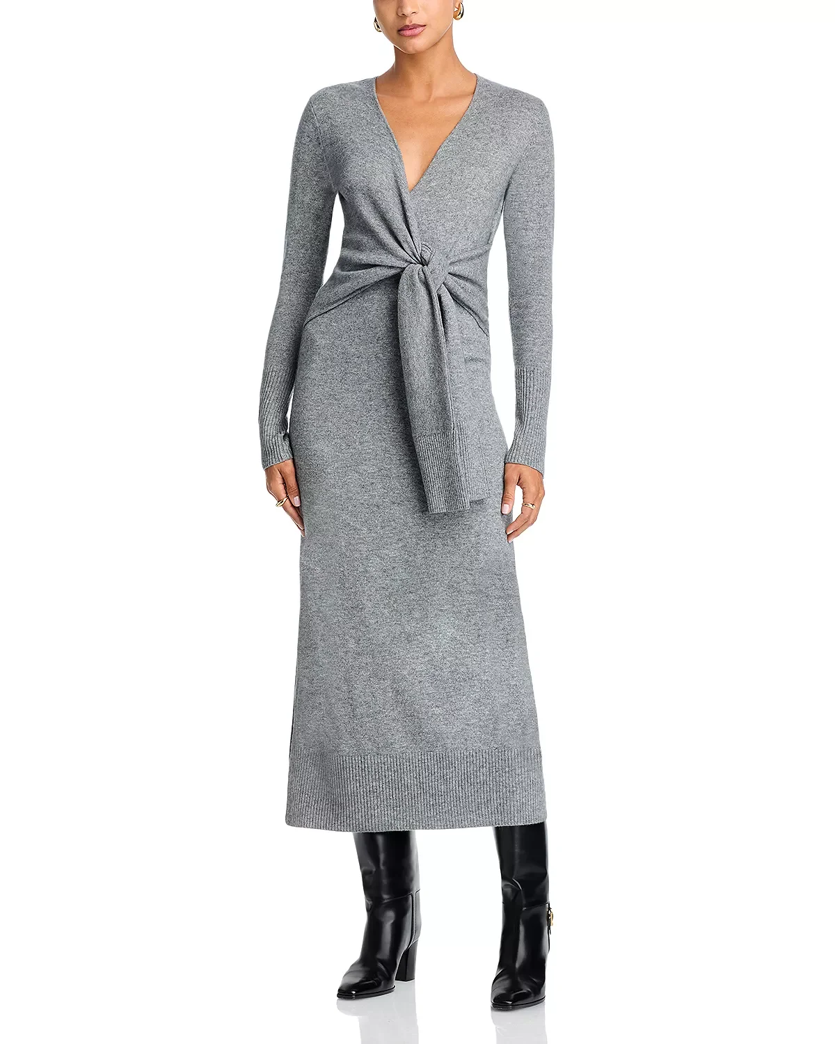 SIZE & FIT - Fits true to size, order your normal size - Designed to hit at mid calf - Approx. 49.5" length - Model measurements: 5'10" height, 33.5" bust, 23.5" waist, 34.5" hips PRODUCT DETAILS - Crossover V-neck - Long sleeves - Front wrap bodice with tie closure - Ribbed trim at cuffs, tie, and hem - Imported Web ID: 5772459 MATERIAL & CARE - 70% merino wool/30% cashmere - Dry clean