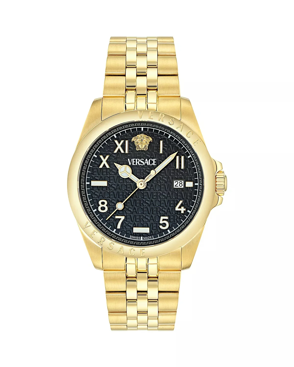 PRODUCT DETAILS - Gold IP; stainless steel; sapphire crystal - Case size: 41mm - Deployant clasp closure - Water resistant to 5 ATM - Swiss quartz movement - Black dial with date display at 3 o'clock - Gold IP stainless steel link bracelet - Manufacturer's two-year limited warranty - Photo may have been enlarged and/or enhanced. - Made in Switzerland Web ID: 5246949