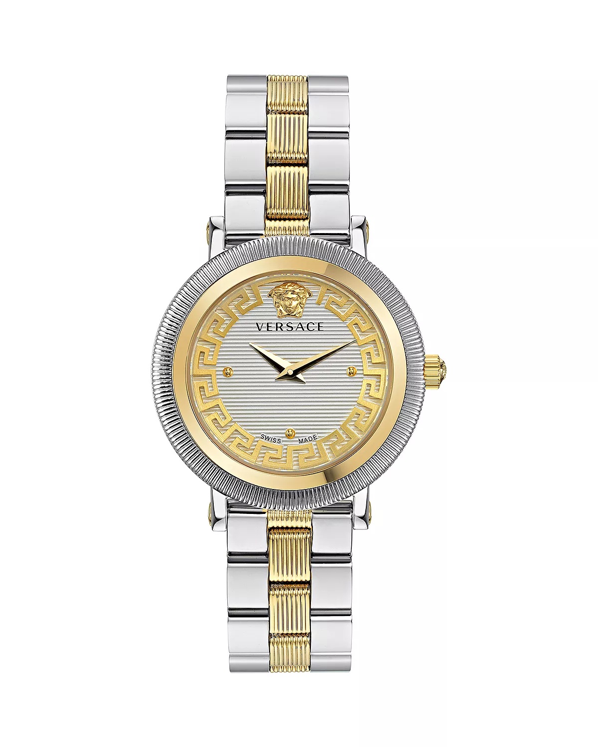 PRODUCT DETAILS - Gold IP; stainless steel; sapphire crystal - Case size: 35mm - Deployant clasp closure - Water resistant to 5 ATM - Swiss quartz movement - Silver-tone dial - Two-tone stainless steel link bracelet - Manufacturer's two-year limited warranty - Photo may have been enlarged and/or enhanced. - Made in Switzerland Web ID: 4878144