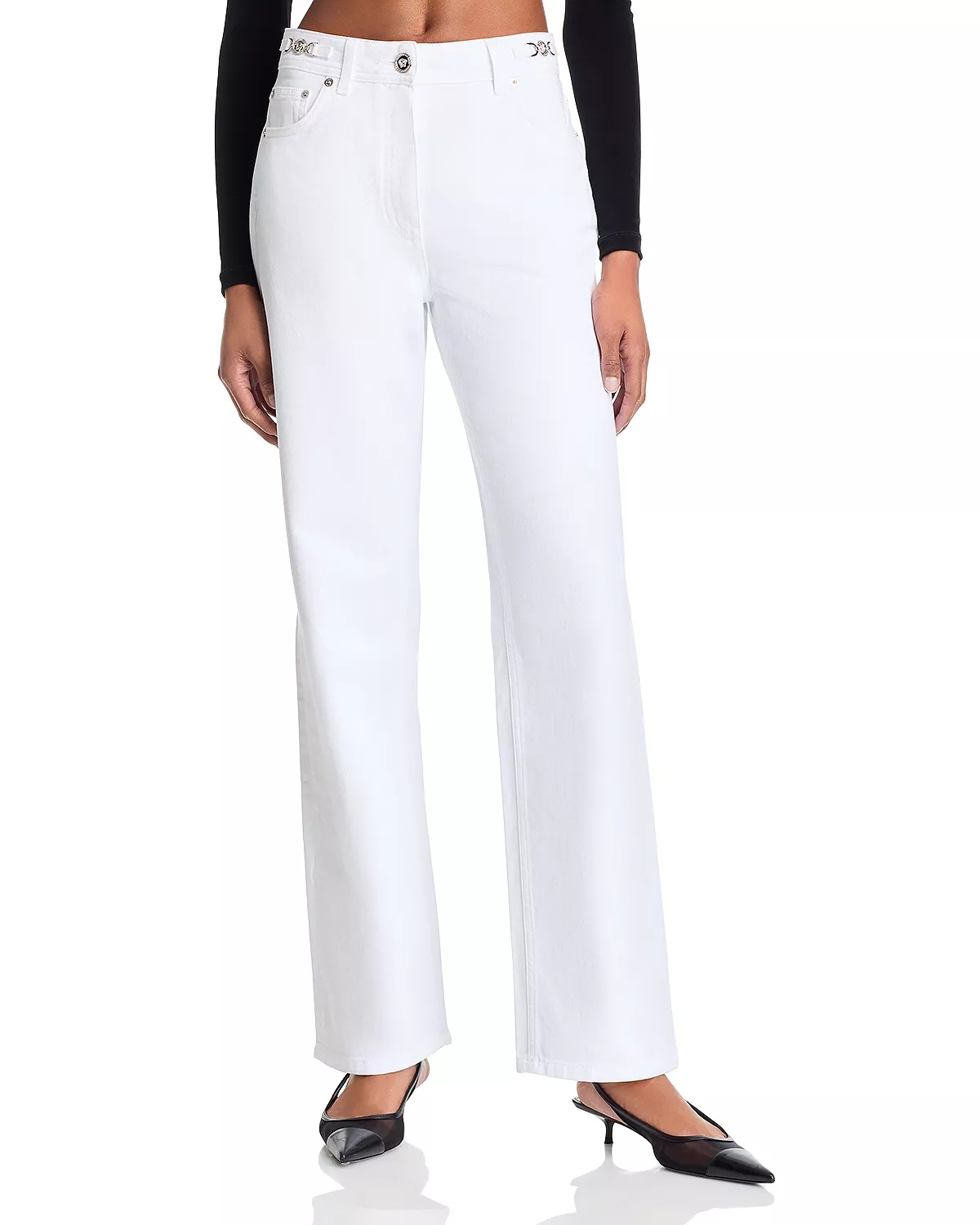 SIZE & FIT - Fits true to size, order your normal size - High rise: 10" - Long inseam: 32" - Leg opening: 12" - All measurements based on a size 27 - Model measurements: 5'10" height, 33" bust, 25" waist, 35" hips PRODUCT DETAILS - Button closure at waist, five-pocket silhouette - Tonal stitching, silver-tone hardware, belt loops - Embossed chain-tab detail at front waist - Made in Italy Web ID: 5320970 MATERIAL & CARE - 100% cotton - Machine wash