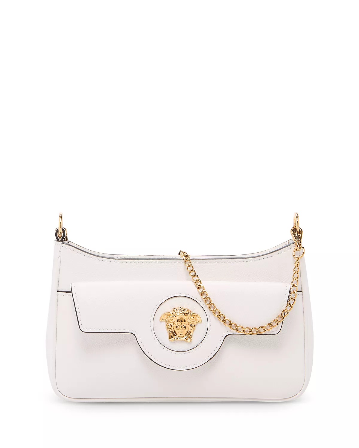 PRODUCT DETAILS - Chain handle - Adjustable shoulder strap - Dimensions: 8.3"W x 2"D x 5"H - Zip closure - Exterior front pocket - Logo hardware on front - Model measurements: 5'10" height, wearing a size 4 or small - Fabric lining - Leather; lining: 100% cotton - Made in Italy Web ID: 5296378