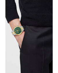 PRODUCT DETAILS - Gold IP; stainless steel; sapphire crystal - Case size: 44mm - Deployant clasp closure - Water resistant to 5 ATM - Swiss quartz chronograph movement - Green dial with date display at 4 o'clock - 3 sub-dials; gold-tone bezel - Two-tone stainless steel link bracelet - Manufacturer's two-year limited warranty - Photo may have been enlarged and/or enhanced. - Made in Switzerland Web ID: 5052335