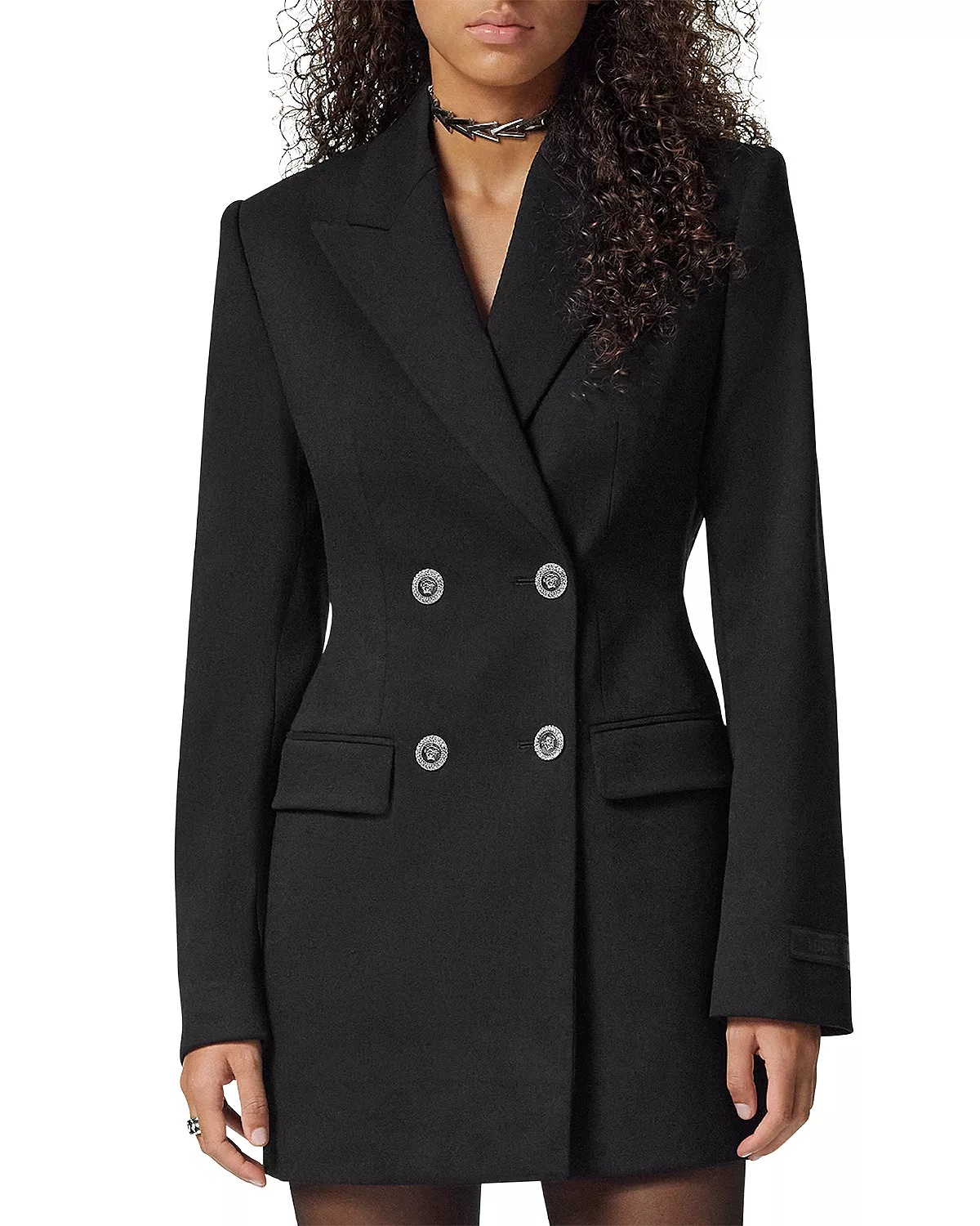 SIZE & FIT - Fits true to size, order your normal size - Model measurements: 5'10" height, 33" bust, 25" waist, 35" hips, wearing a size 36 IT PRODUCT DETAILS - Notched collar - Long sleeves - Double breasted button closures - Open back with metallic drape - Flap pockets at sides - Lined - Made in Italy Web ID: 5320878 MATERIAL & CARE - Shell: 98% virgin wool/2% elastane; trim: 100% metallic; lining: 74% viscose/26% polyester - Dry clean
