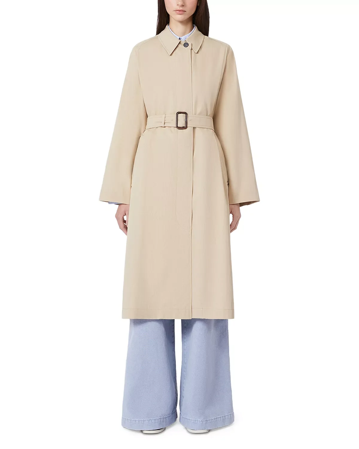 SIZE & FIT - Fits true to size, order your normal size PRODUCT DETAILS - Point collar - Long sleeves, button tab cuffs - Front button closures - Buckled belt at waist - Slit pockets at hips - Lined - Imported Web ID: 5902324 MATERIAL & CARE - Shell: 68% cotton/32% polyamide; sleeve lining: 65% acetate/35% viscose; lining: 100% cotton - Dry clean