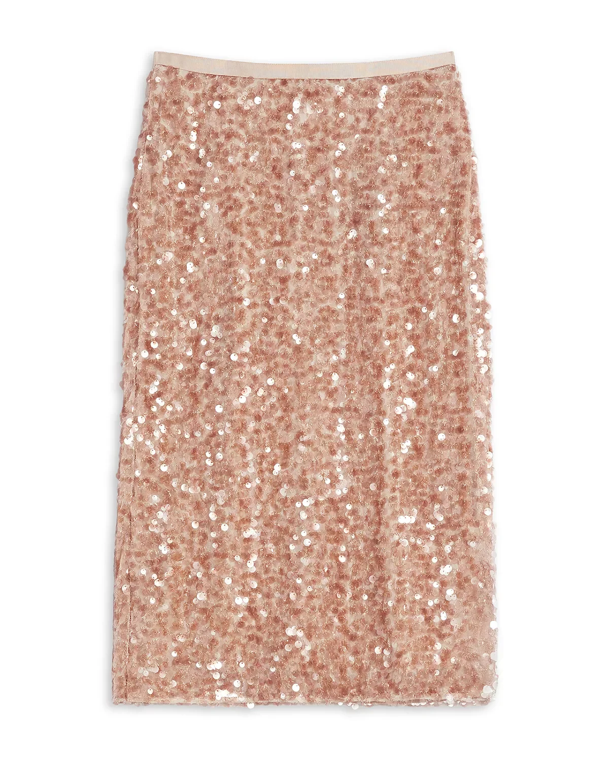 SIZE & FIT - Fits true to size, order your normal size - Designed to hit at calf PRODUCT DETAILS - Grosgrain ribbon waist - Side zip closure - Allover sequin-embroidered detail - Embroidered tulle skirt - Pencil silhouette - Back slit - Lined - Imported Web ID: 5903148 MATERIAL & CARE - Jersey fabric: 100% polyester; joining thread: 100% polyester; lining: 91% polyester/9% elastane, exclusive of decoration - Hand wash