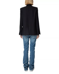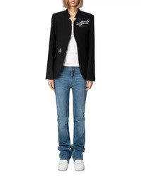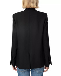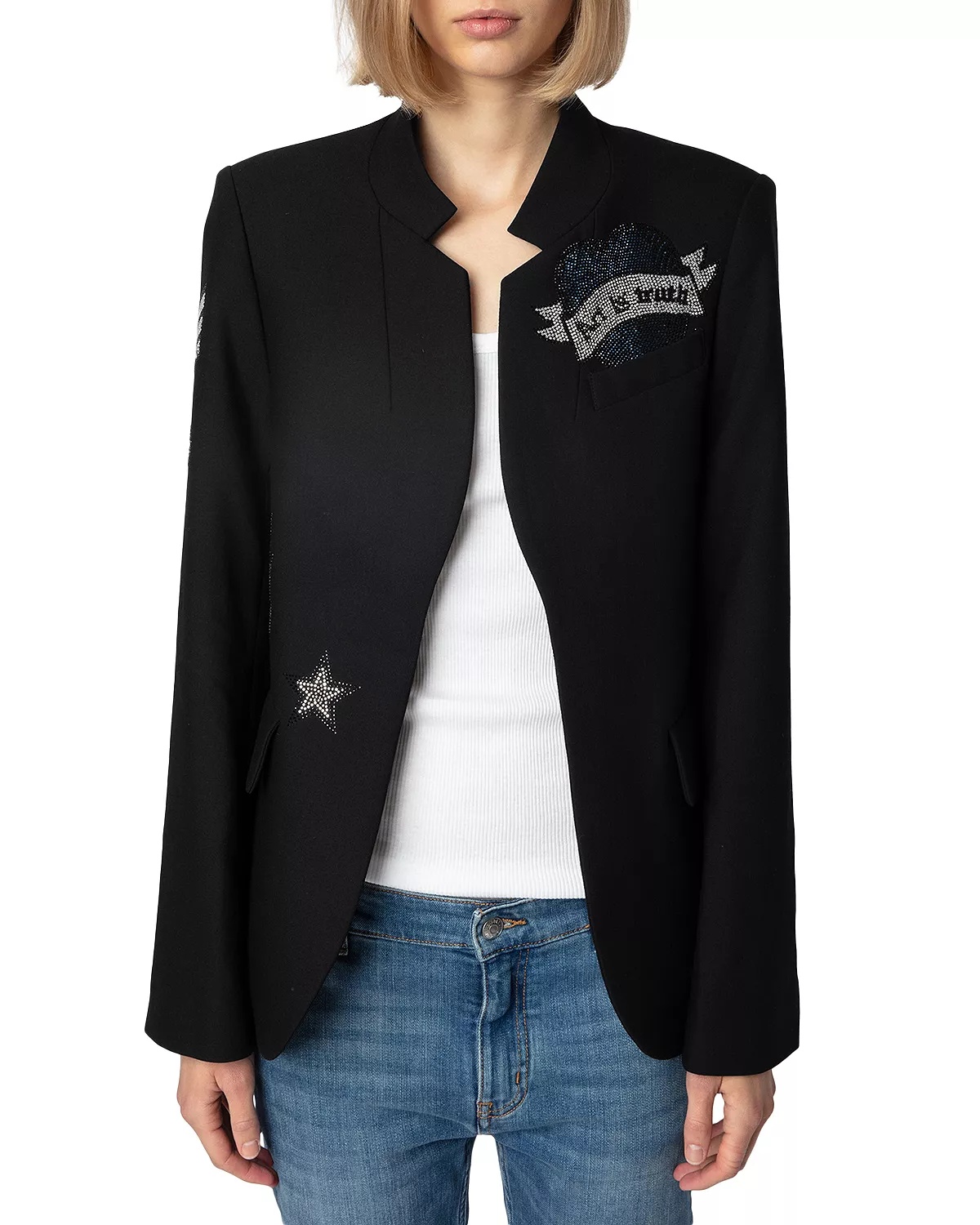 SIZE & FIT - Fits true to size, order your normal size - Hits at hips PRODUCT DETAILS - Inverted notched collar - Long sleeves with split cuffs - Open front - Rhinestone details at front - Imported Web ID: 5459499 MATERIAL & CARE - Shell: 69% polyester/23% viscose/8% elastane; lining: 100% cotton - Dry clean