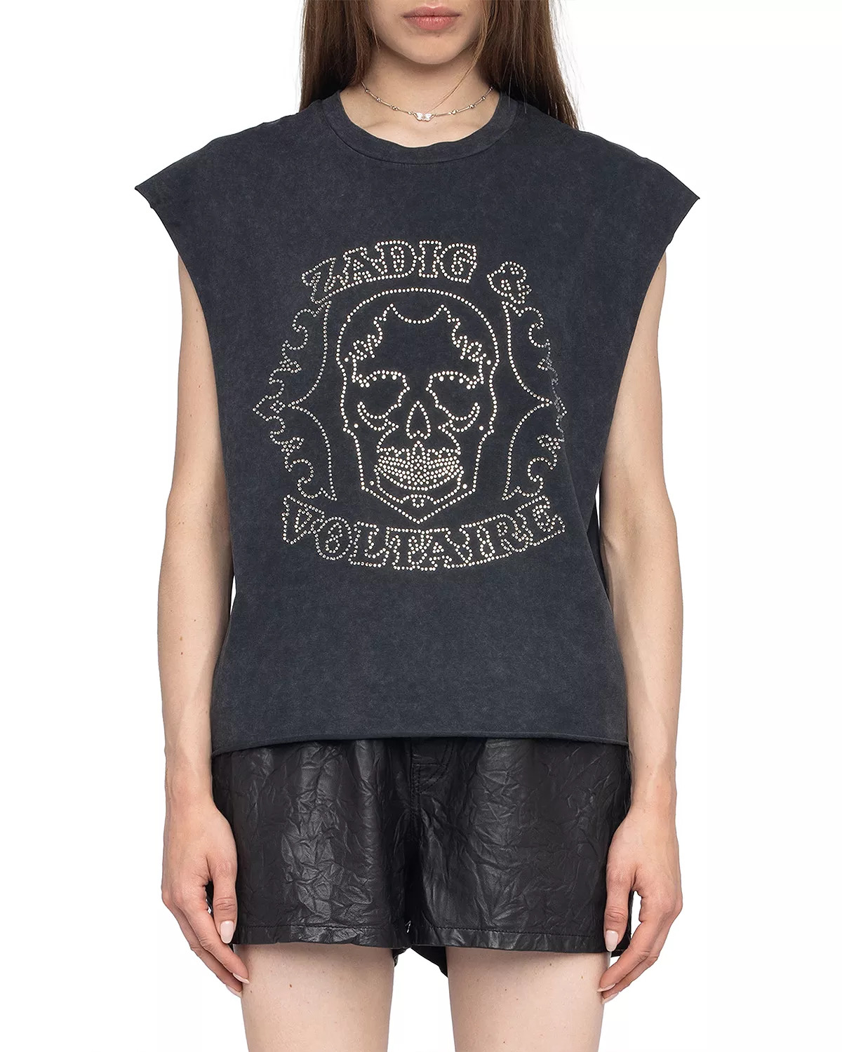 SIZE & FIT - Fits true to size, order your normal size PRODUCT DETAILS - Banded crewneck - Cap sleeves - Front logo rhinestone skull design - Made in Turkey Web ID: 5577139 MATERIAL & CARE - 100% cotton - Machine wash