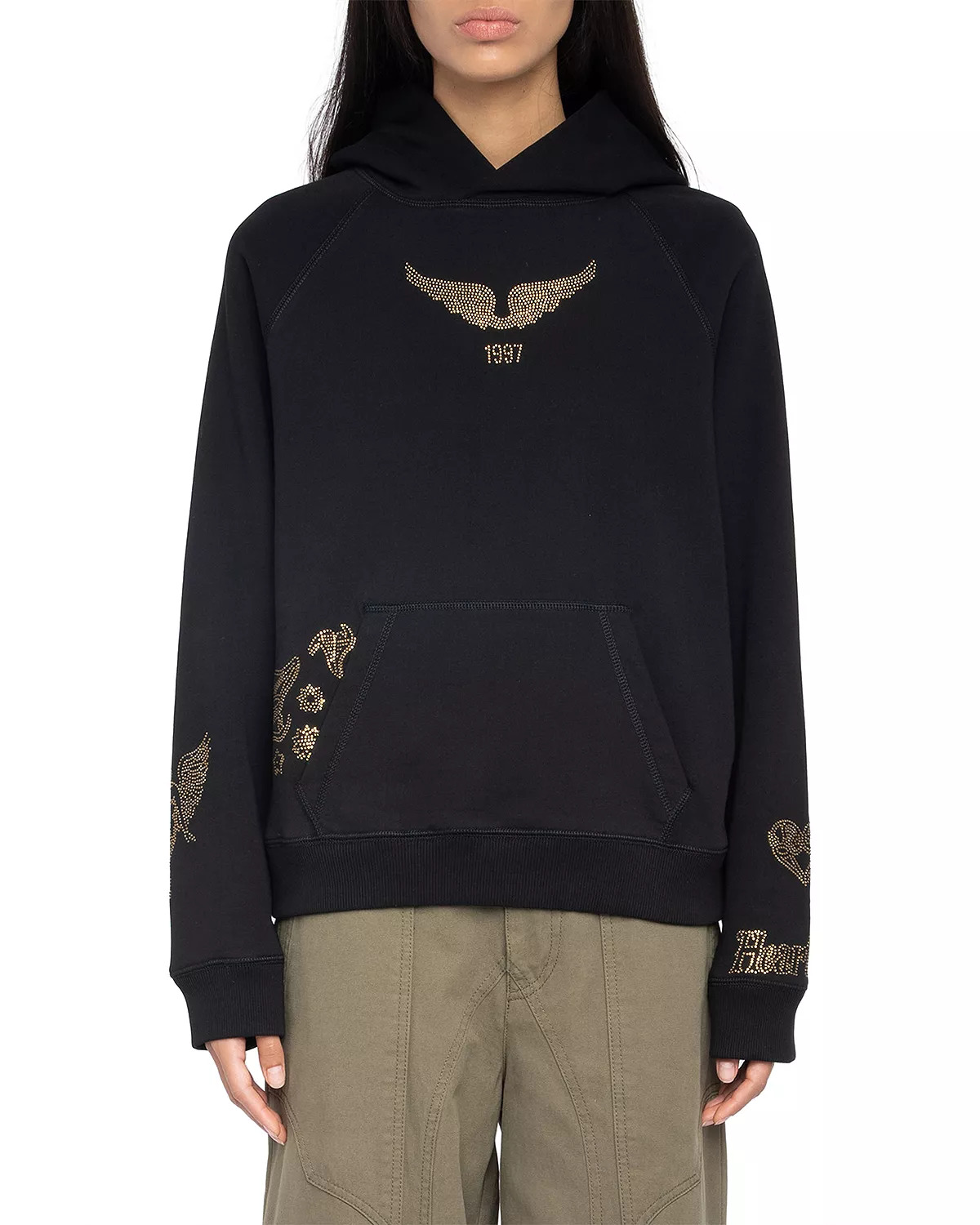 SIZE & FIT - Fits true to size, order your normal size PRODUCT DETAILS - Attached hood - Long raglan sleeves - Embellished rhinestone designs at hood, chest, right side, and sleeves - Front kangaroo pocket - Ribbed trim at cuffs and hem - Made in India Web ID: 5577104 MATERIAL & CARE - 100% cotton - Machine wash