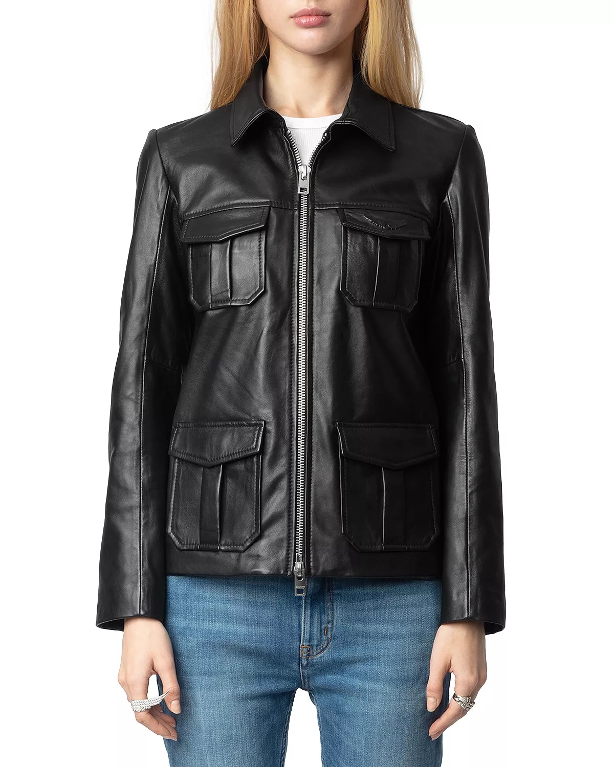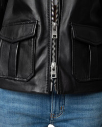 SIZE & FIT - Fits true to size, order your normal size PRODUCT DETAILS - Point collar - Long sleeves with zipper cuffs - Front zip closure - Flap pockets at front - Embossed wings at chest - Made in India Web ID: 5381470 MATERIAL & CARE - Shell: leather; lining: 100% polyester - Professional leather clean