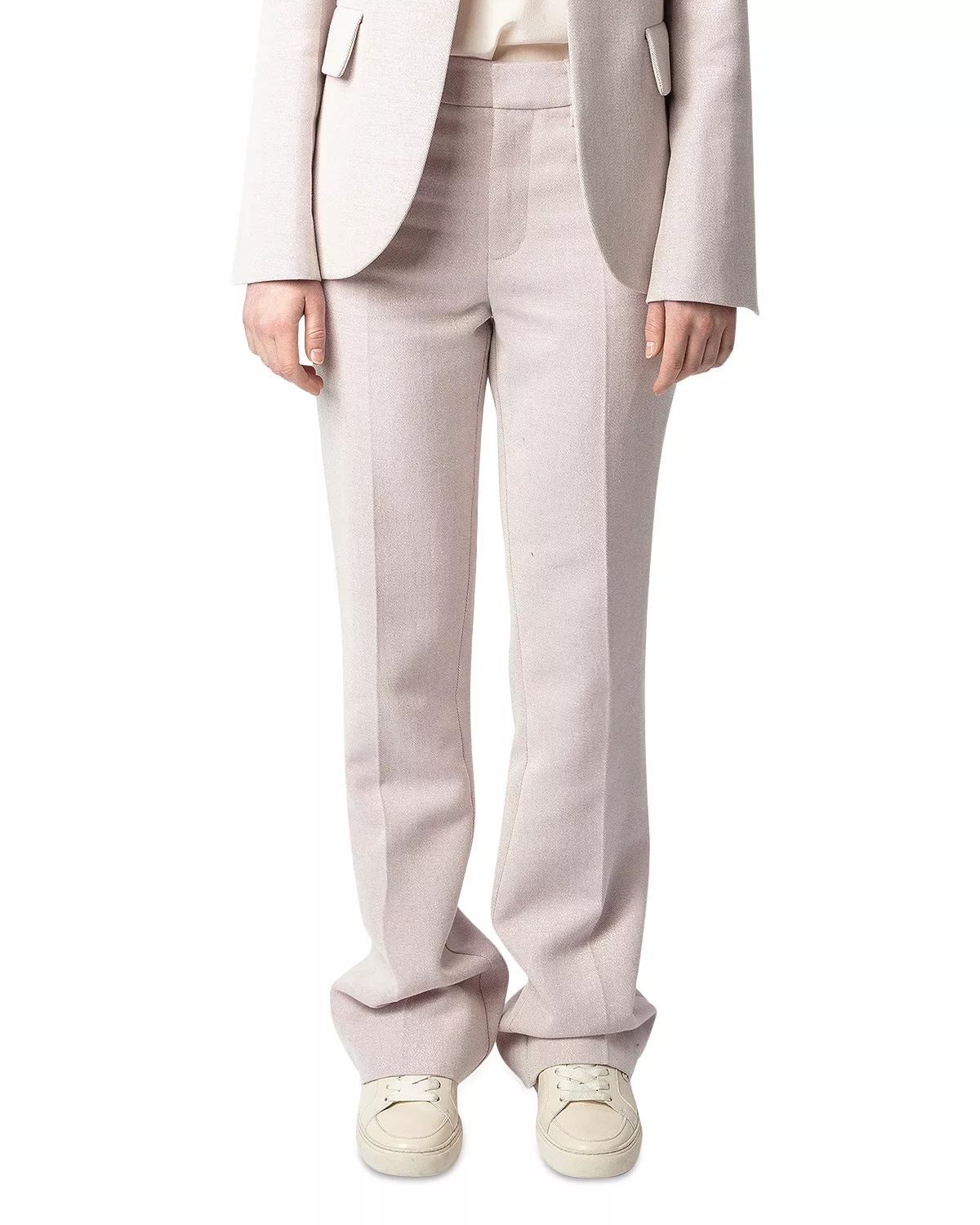 SIZE & FIT - Fits true to size, order your normal size PRODUCT DETAILS - Zip fly with hook-and-bar closure, belt loops - Flare-leg silhouette - Two side slant pockets; two back welt pockets - Shimmer finish - Imported Web ID: 5381573 MATERIAL & CARE - 48% cotton/22% viscose/20% cotton/5% polyamide/5% polyester - Dry clean