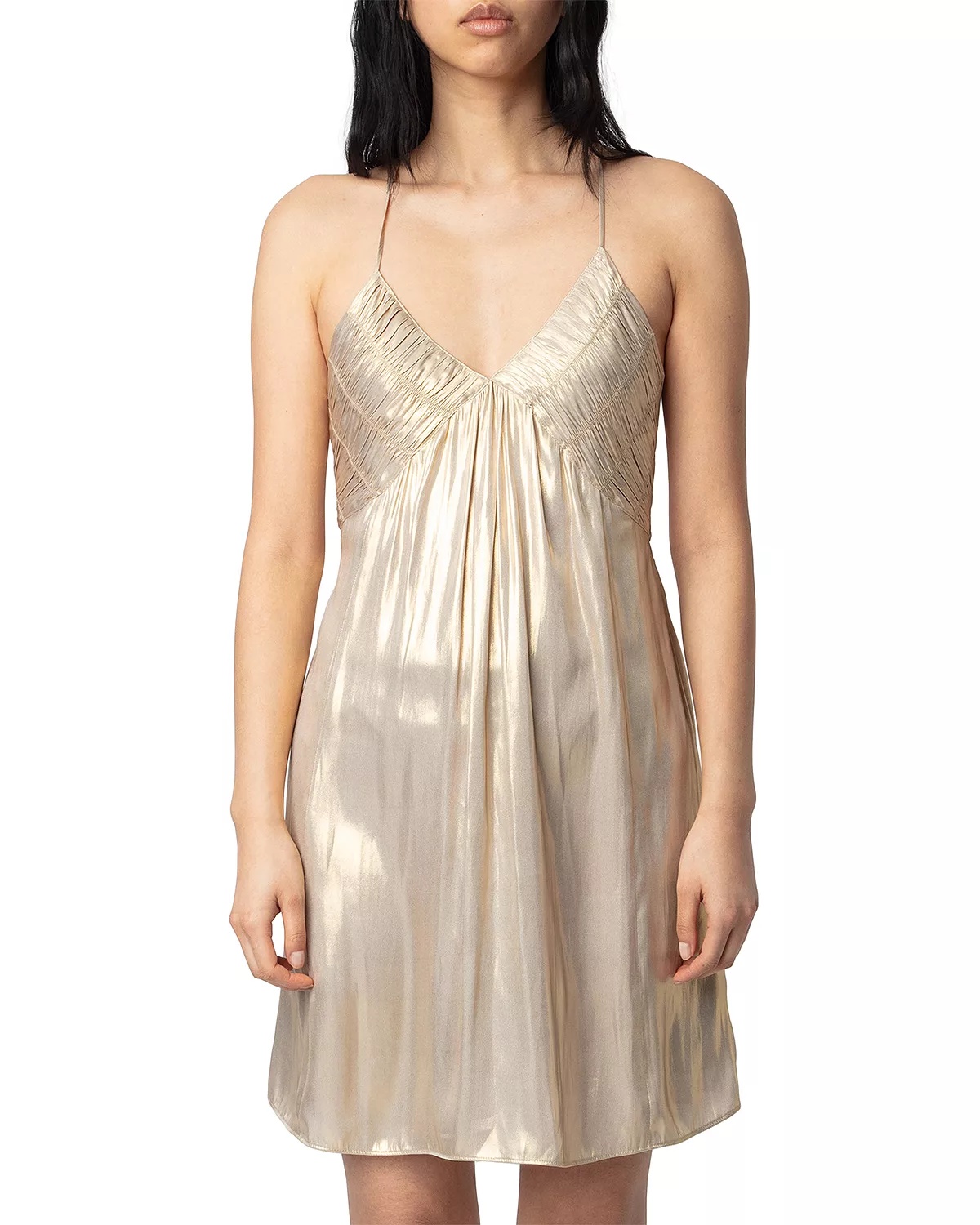 SIZE & FIT - Fits true to size, order your normal size - Designed for a mini length PRODUCT DETAILS - V-neck - Gathered detail at bodice and back - Sleeveless with adjustable cross-back straps - Imported Web ID: 5381549 MATERIAL & CARE - 100% polyester - Hand wash