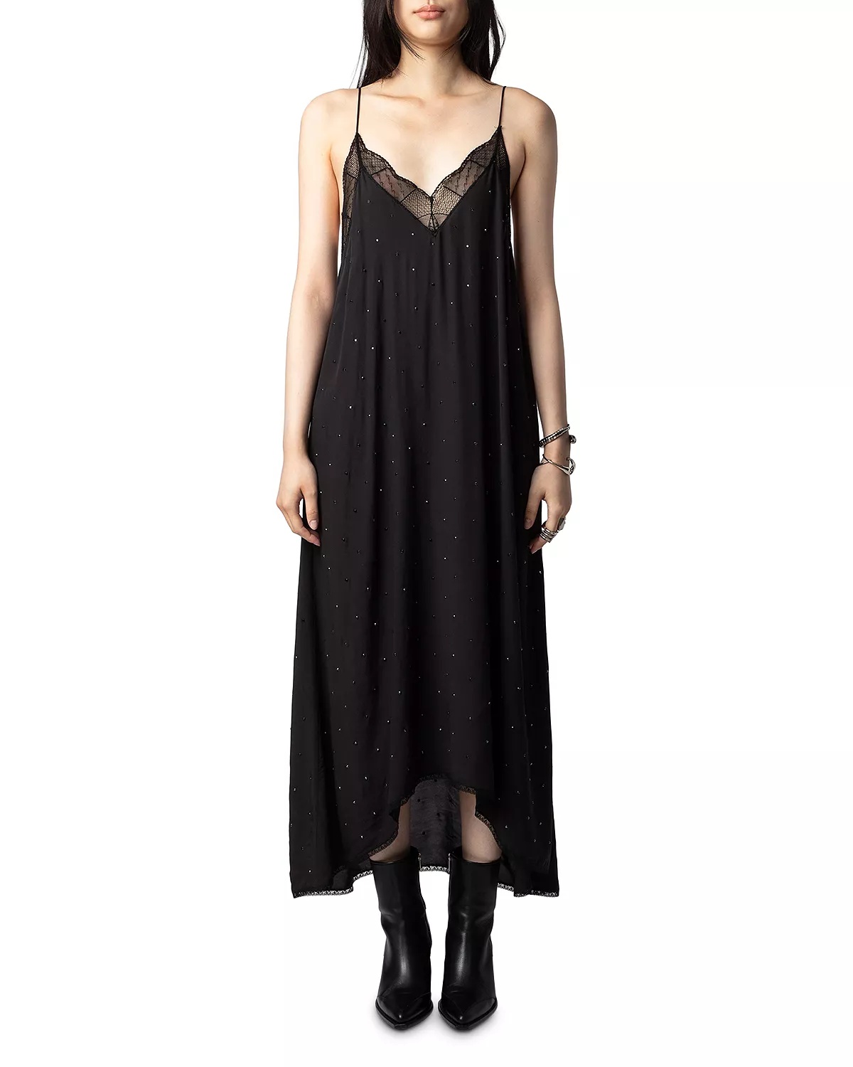 SIZE & FIT - Fits true to size, order your normal size - Designed for a floor-length look PRODUCT DETAILS - V-neck - Sleeveless, thin straps - Pullover style - Lace trim at neck, back and hem - High/low hem - Allover diamante embellished - Please note that this dress will be delivered with a black b-tag attached, with instructions for removal included. If the b-tag is removed, the dress cannot be returned. - Imported Web ID: 5118190 MATERIAL & CARE - 100% viscose - Machine wash or hand wash