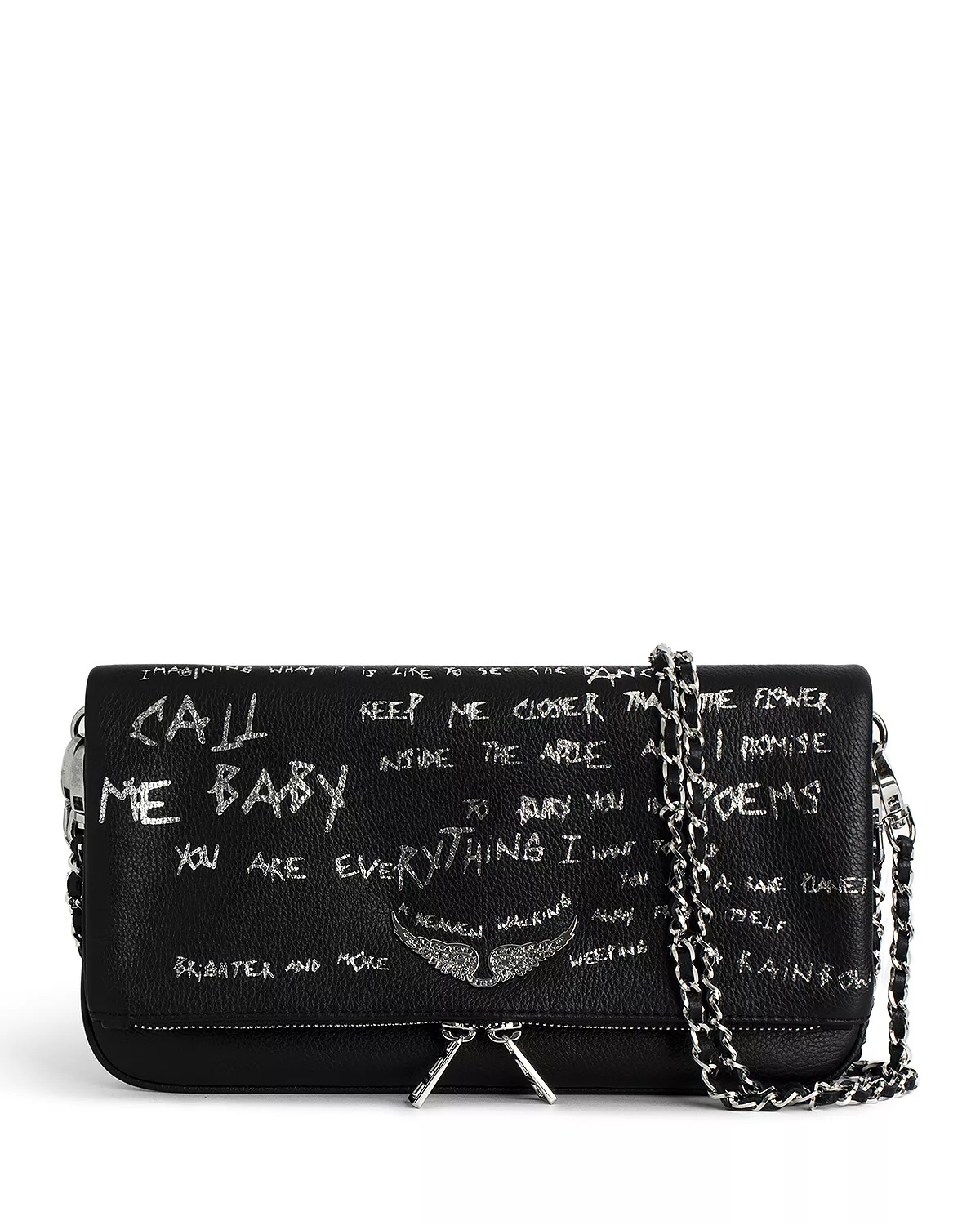PRODUCT DETAILS - Removable chain crossbody strap, 21.2" drop - Chain shoulder strap, 14" drop - Dimensions: 9"W x 2.5"D x 7"H - Flap with magnetic closure - Exterior zip pocket & interior slip pocket - Signature graffiti print - Silver-tone hardware - Wing detail with rhinestones - Lined - Main: leather; lining: 100% cotton - Made in India Web ID: 5381390