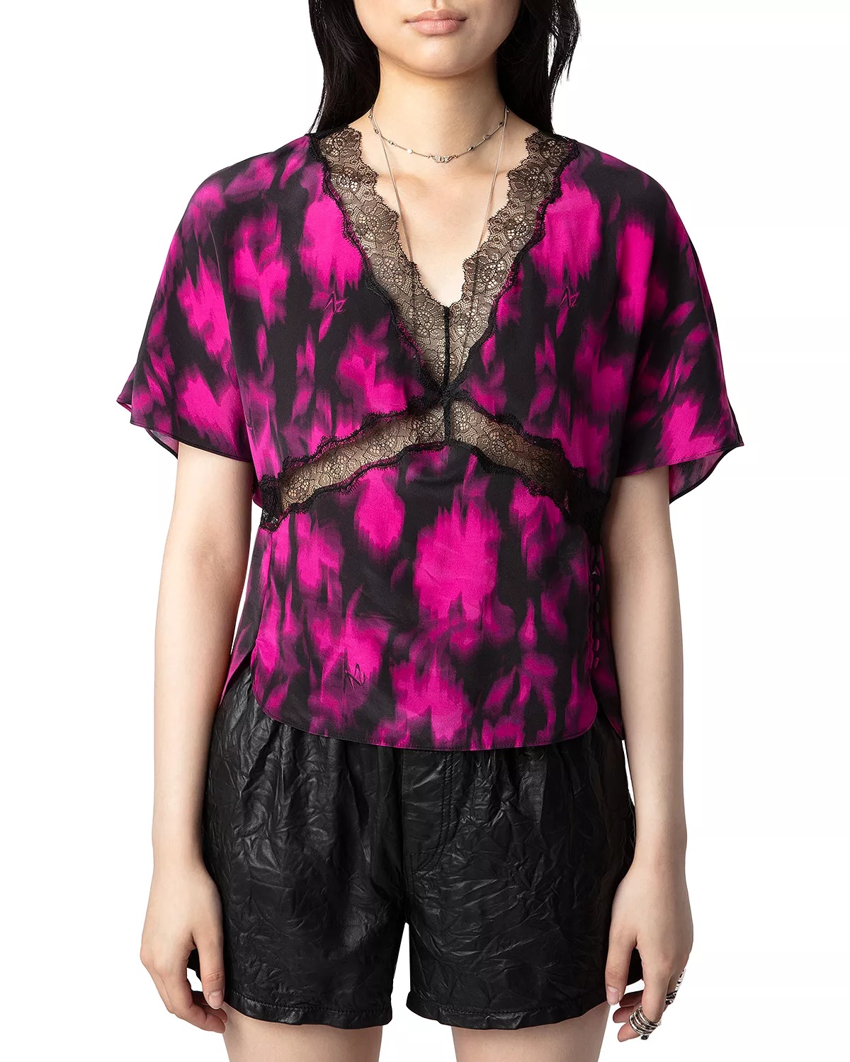 SIZE & FIT - Fits true to size, order your normal size - Designed for a cropped fit PRODUCT DETAILS - V-neck with lace-trim - Short butterfly sleeves - Pullover style - Allover blurred print - Lace inset at waist - Imported Web ID: 5118232 MATERIAL & CARE - 100% silk - Machine wash or hand wash