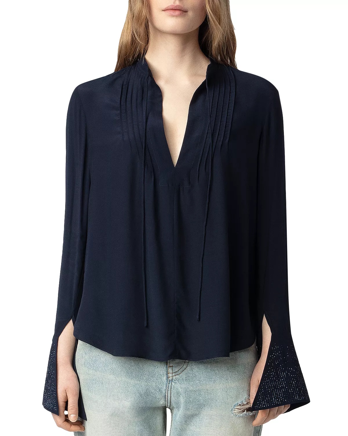 SIZE & FIT - Fits true to size, order your normal size; if between sizes, order one size up PRODUCT DETAILS - Tie neck - Long sleeves, rhinestone patterns on cuff - Pullover style - Pintuck details at front and back - Imported Web ID: 5381584 MATERIAL & CARE - 100% viscose - Hand wash or machine wash