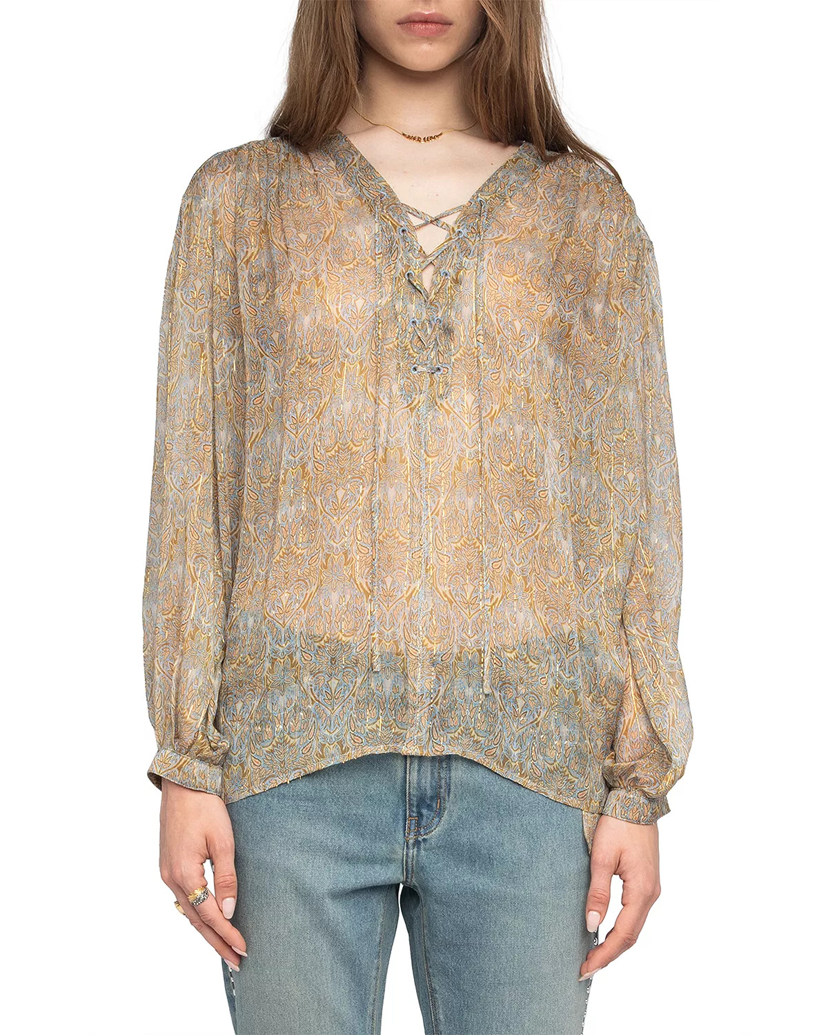 SIZE & FIT - Fits true to size, order your normal size PRODUCT DETAILS - V-neck with lace-up detail - Long balloon sleeves - Pullover style - Imported Web ID: 5577400 MATERIAL & CARE - 97% viscose/3% metallic fibers - Hand or machine wash