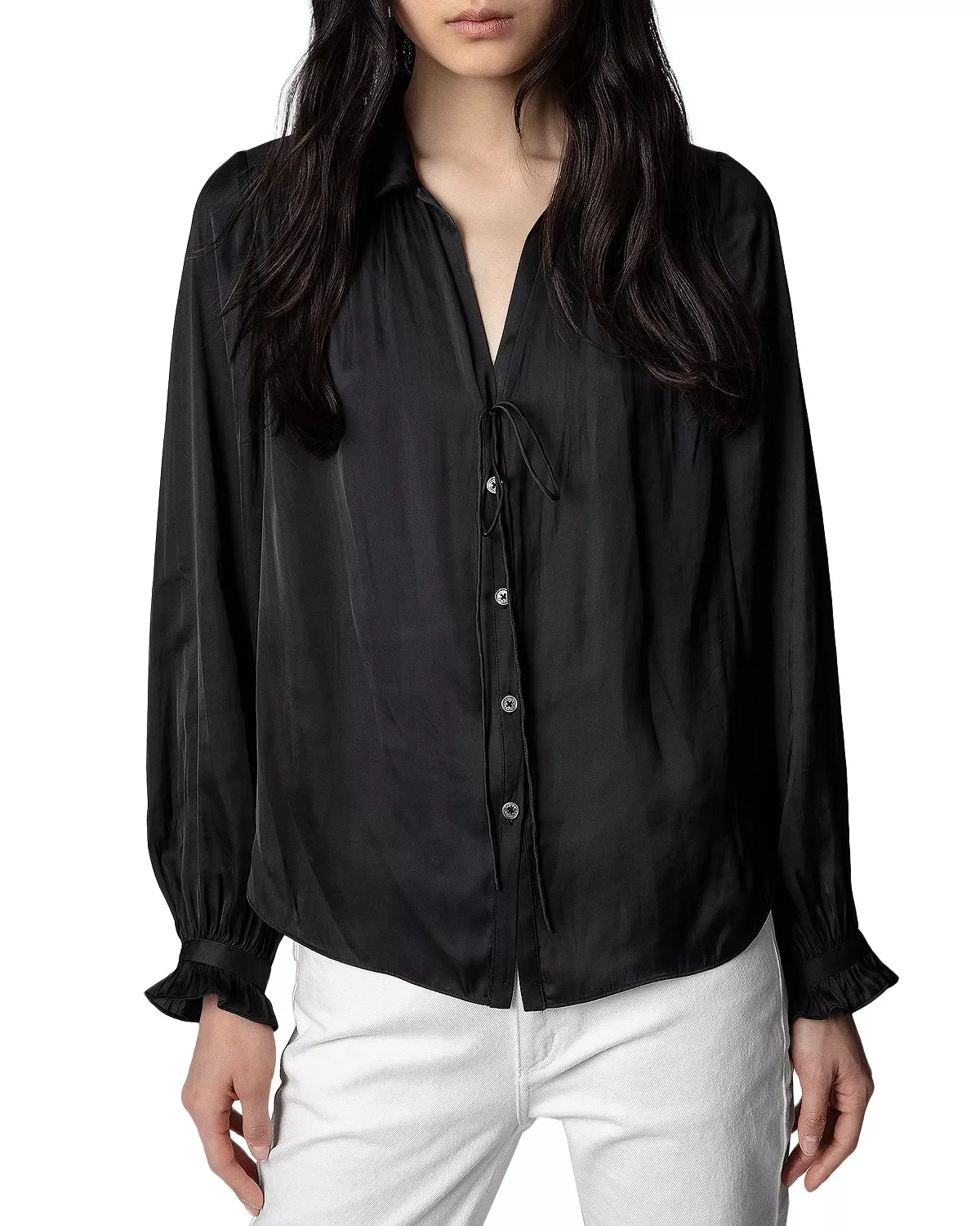 SIZE & FIT - Fits true to size, order your normal size - Model measurements: 5'10" height, 33.5" bust, 23.5" waist, 34.5" hips PRODUCT DETAILS - Spread collar - Ruching at front shoulder seams - V-neck with self tie detail - Button front closures - Long sleeves with ruffled button cuffs - Ruched at back yoke - Imported Web ID: 4502868