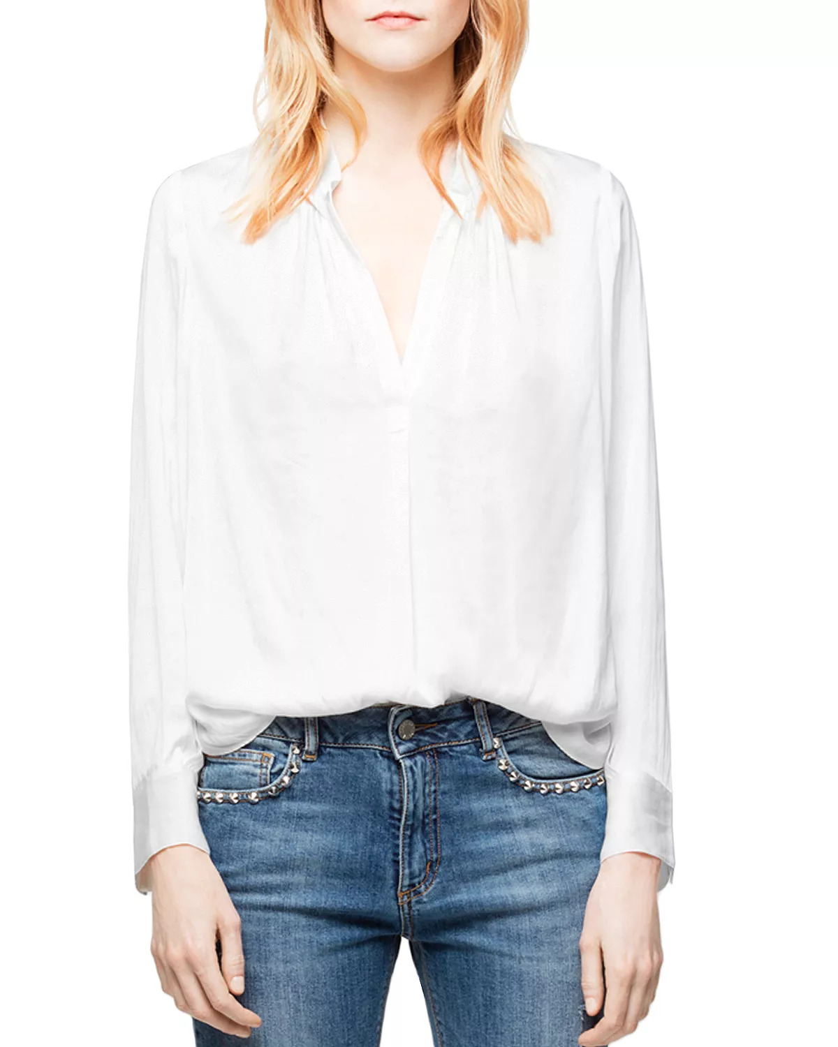 PRODUCT DETAILS - Fits true to size, order your normal size; if between sizes, order one size up - Model measurements: 5'11" height, 30" bust, 23" waist, 34.5" hips, wearing a size small - Band collar, V-neck, long sleeves - Button cuffs, front inverted pleat - High/low rounded hem, notched sides - Shirred back, relaxed silhouette - Imported Web ID: 3045471 MATERIAL & CARE - Polyester - Machine wash or dry clean