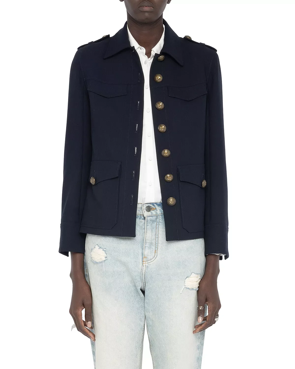 SIZE & FIT - Fits true to size, order your normal size PRODUCT DETAILS - Classic point collar - Front button closures - Long sleeves, buttoned cuffs - Buttoned epaulets at shoulders - Two chest flap pockets, two buttoned-flap front pockets - Lined - Made in Portugal Web ID: 5777721 MATERIAL & CARE - 69% polyester/23% viscose/8% elastane; lining: 100% polyester - Dry clean