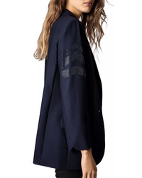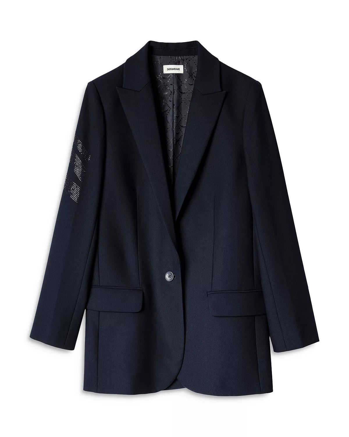 SIZE & FIT - Fits true to size, order your normal size PRODUCT DETAILS - Peak lapels - Button front closure - Long sleeves; tonal rhinestone arrows at right sleeve - Two front flap pockets - Vented back - Lined - Imported Web ID: 4125564 MATERIAL & CARE - 69% polyester/23% viscose/8% elastane; body lining: 100% viscose; sleeve lining: 50% acetate/50% viscose - Dry clean