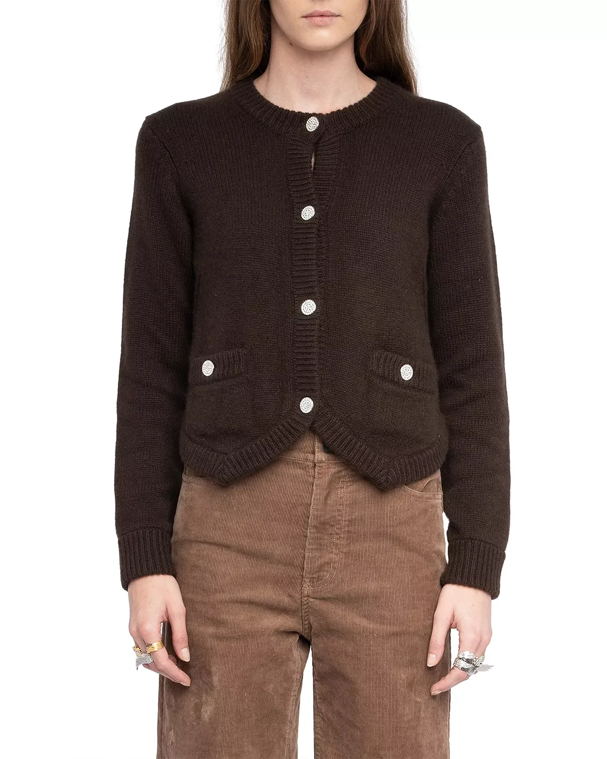 SIZE & FIT - Fits true to size, order your normal size - Designed for a relaxed fit - Hits at waist PRODUCT DETAILS - Round neck - Button front closures, embellished buttons - Long sleeves - Button trim pockets at front - Ribbed at neck, cuffs, pockets and hem - Asymmetric hem - Imported Web ID: 5577148 MATERIAL & CARE - 100% cashmere - Hand wash