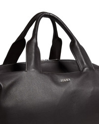 PRODUCT DETAILS - Two top handles - Removable, adjustable webbing strap - Grey mélange cotton lining - Dimensions: 17.3"W x 6.6"D x 11.8"H - Zip closure - Zegna Logo hardware - Made in Italy Web ID: 5257223 MATERIAL & CARE - Shell: leather; lining: cotton - Spot clean