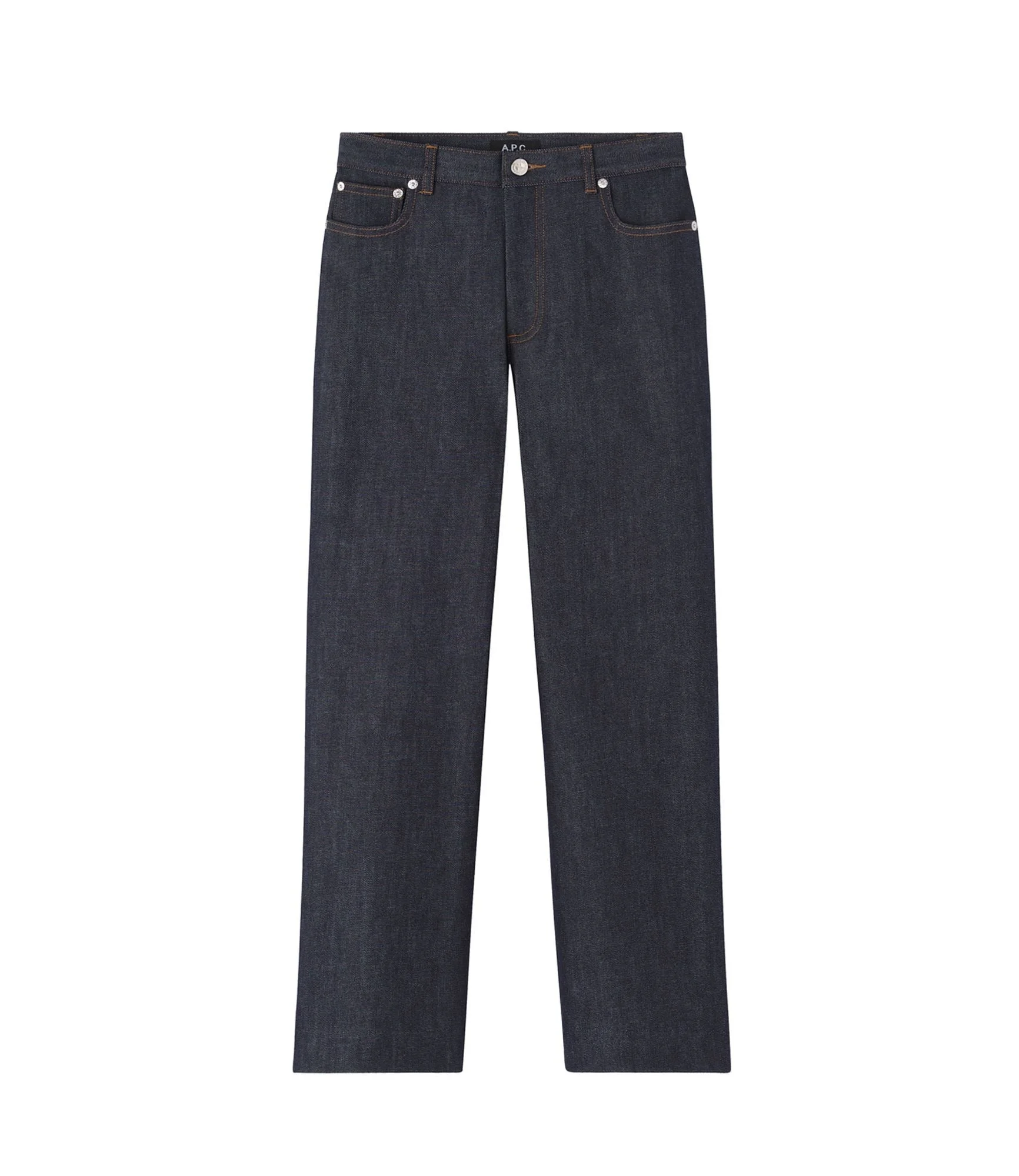 Indigo denim jeans with a straight, cropped and flared leg. - High waist jeans. - Fitting at the hips. - Straight legs. - 7/8 length. - Zip fly. - Caramel stitching. Details - 100% cotton. - Machine wash cold (30°C) inside-out. - Gentle cycle. - Do not tumble dry. - These jeans may seem shrunken after washing, but they return to their original shape when worn.