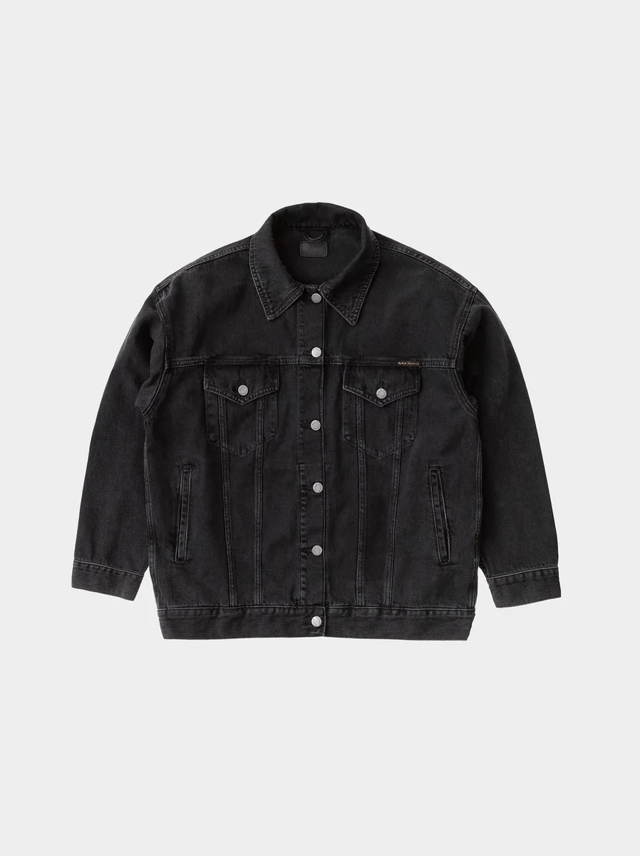 Relaxed-fit denim jacket in washed-out black denim. There is something super classic and super lovely with dark gray denim! Made from organic cotton. Description. Relaxed-fit denim jacket made in organic cotton. The Elin jacket has two symmetrical chest pockets, two welt front pockets, and a straight front yoke where the pocket flaps are attached. Details. - Organic cotton - 12.5 oz. Rigid denim - Black thread on all seams - Antique silver trims - Jacron patch - Relaxed fit - 100% cotton - Made in Tunisia