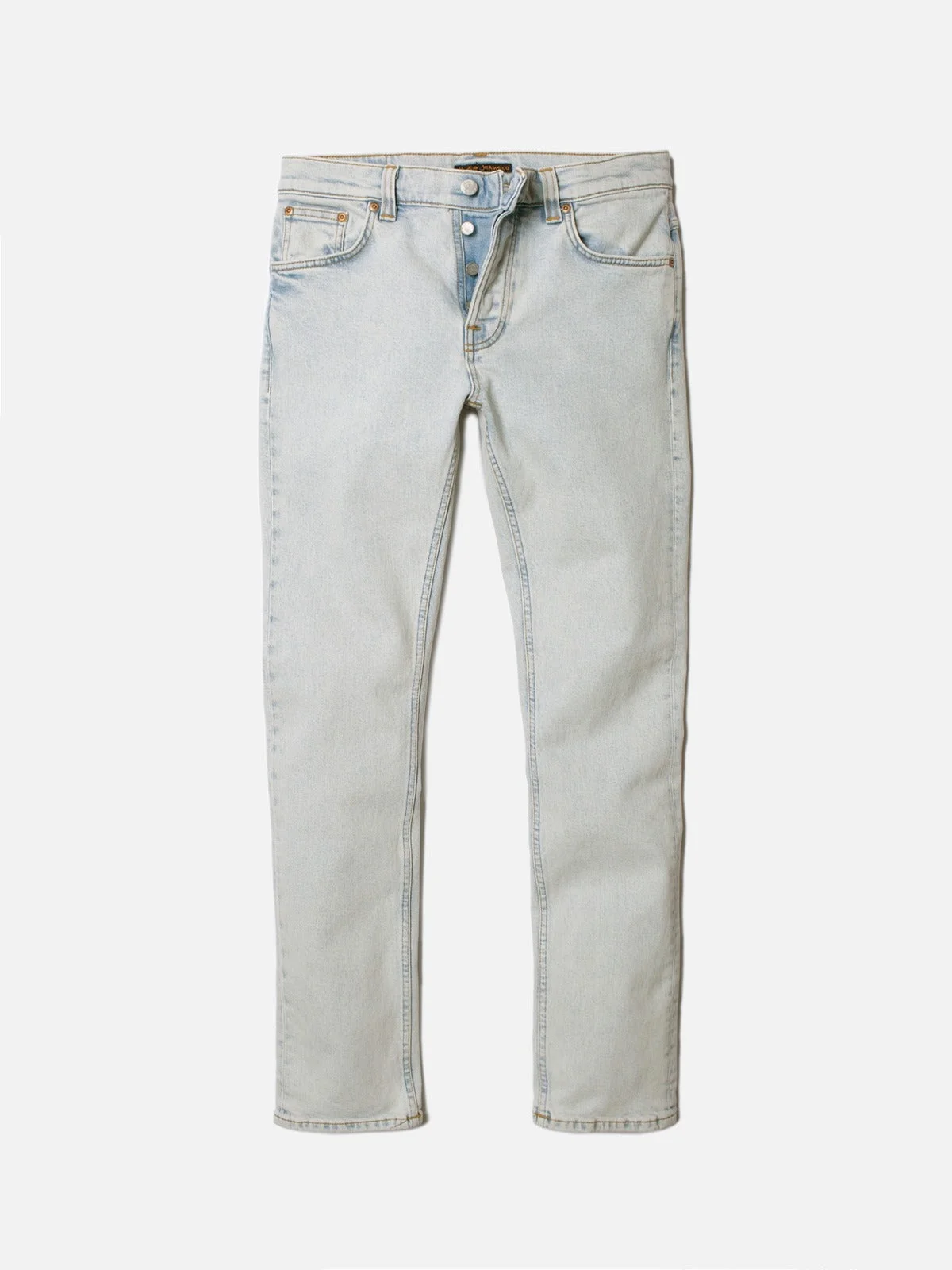 Straight-leg slim-fit stretch jeans with a bright sun-bleached wash. Made with organic cotton. Details - Organic cotton - 13.2 oz. comfort stretch denim - Details - Tobacco thread at seams - Stainless steel button - Copper rivets - Button fly - Jacron patch - Slim fit - Mid waist - Straight leg - Slim leg opening 99% Cotton 1% Elastane Made in IT A straight-leg slim-fit with a bright, washed-out, and sun-bleached look. We made it on a bright blue denim, which is a sound choice, both from an environmental point of view and also for the aesthetics we're going for with this one.