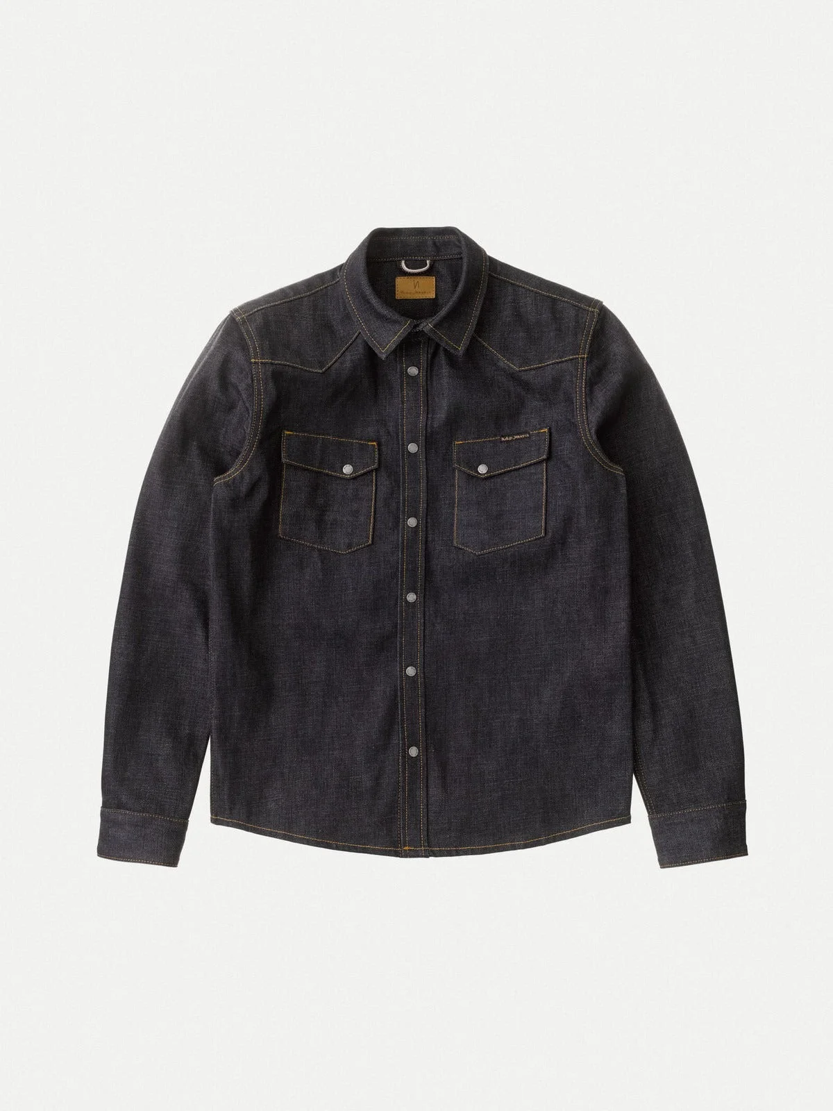 Details - Organic cotton - 14.2 oz. Japanese rigid selvage denim - Tobacco thread all over - Antique silver trims - Pointy front and back yoke - Nudie Jeans signature pocket shape - Slim fit 100% Cotton Made in TN It is with the warmest of welcomes we greet Jonas Dry Ace Selvage to Nudie's range of selvage denim shirts. Jonas is Nudie's slim fit, western-style, denim shirt. Jonas is also one of Nudie's most appreciated denim shirts so it was with great pleasure we paired it with the Dry Ace Selvage fabric - one of Nudie's absolute favorite selvage fabrics out there. The Dry Ace Selvage is an utterly beautiful and sturdy 14.2 oz, redcast selvage denim. It is woven by none other than Shinya Mills in Okayama, Japan. The warp yarns have been dip-dyed 20 times in pure indigo, giving the denim its dark, pure indigo, redcast tone. The naturally slubby yarns, woven under low-tension, has produced the perfectly chunky and uneven surface structure, making this fabric hit the very spot where imperfection turns into perfection. And that is by no means without cause, Shinya Mills, being outstandingly great at denim, recreated the Dry Ace Selvage fabric by analyzing the denim of a pair of worn-in jeans from the 50s. Dig that, recreating a dry denim from a washed, worn, and torn pair of jeans – that is some reverse engineering right there! Now, this is just the starting point from which the Jonas Dry Ace Selvage will evolve from. See, we appreciate Dry Ace in its dry state - but in its worn-in - washed or unwashed - state it is marvelously good looking. Due to its redcast tone it evolves to a clear blue hue, its uneven structure generates a salt 'n pepper structure, and where abrasions get most predominant the wear will generate clear twill lines. Needless to say, this denim justifies its name. So, if you, and your upper body, are up for a denim break-in challenge this might very well be the one that counts.