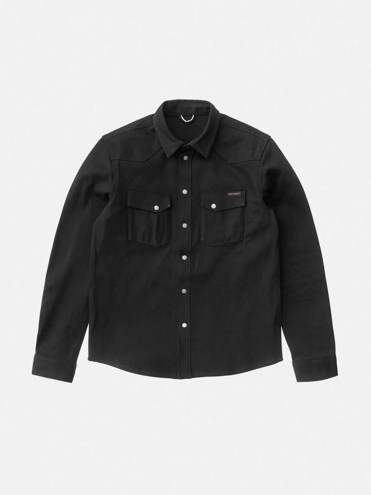 Details - Organic cotton - 12.75 oz. turkish comfort stretch selvage denim - Black thread all over - Antique silver trims - Slim fit 99% Cotton 1% Elastane Made in TN Denim shirt made in crispy 12.75 oz. dry black comfort stretch selvage denim. The starch in the denim gives it its crispy hand and, most importantly, generates pronounced creases on the shirt when worn - allowing for some contrasting fades. The denim itself is woven on old school shuttle looms with yarns that have been yarn dyed. The shuttle looms interlace the yarns into the selvage denim and the yarn dying keeps the core of the yarns white allowing the weave to fade beautifully - a slow process that reflects how denim was made back in the day. The finished denim has a clear twill structure which is nicely balanced by a slight slub character which with wear and washing will get more pronounced in a perfectly imperfect way. The shirt itself is made with felled twin needle seams at body and arms. Front and back yokes have pointy shapes drawing inspiration from classic western shirts. All of these construction details will become more pronounced with wear and generate beautiful contrasts at seams and folds. Selvage details can be found at cuffs, pockets, hang band and at the front placket. If you are familiar with Nudie's shirt fit Jonis, then Jonas is best explained as its twin - looking very similar but with slightly different characteristics. Compared to Jonis, Jonas has more room for movement as well as new shoulder and arm hole construction. Making Jonas more comfortable while still being slim. An improved Nudie classic piece with tons of break-in potential! As with all Nudie's dry denim we recommend at least 6 months of daily wear before the first wash to achieve contrasting fades. This is of course just a recommendation.