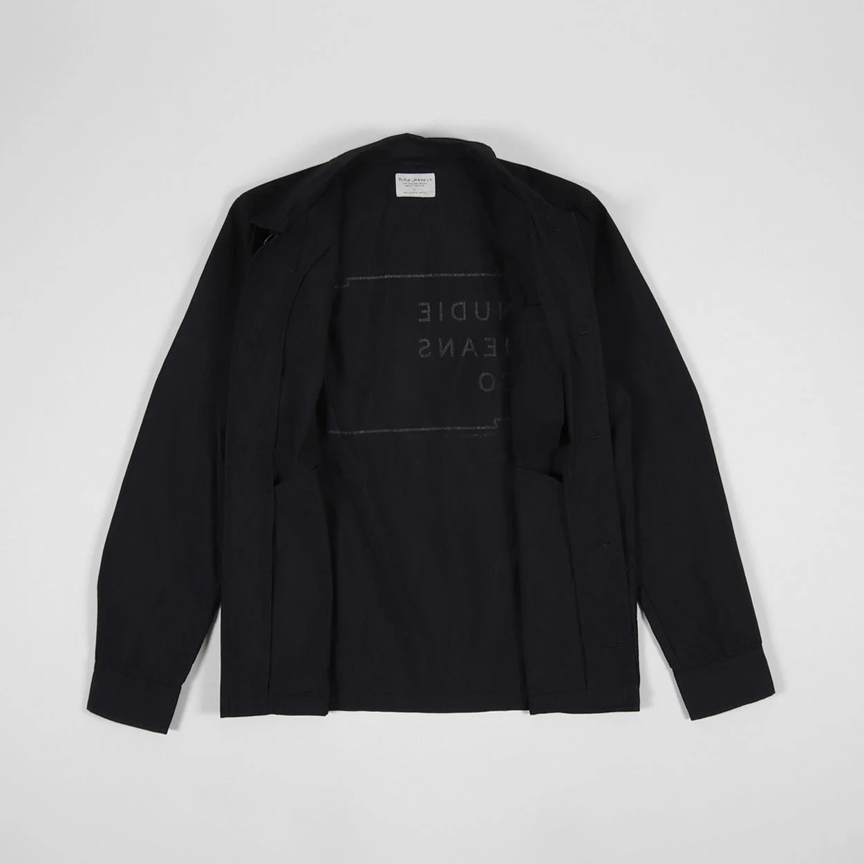 A lightweight jacket from Swedish denim company Nudie Jeans, made from a comfortable and weather-resistant blend of 68% organic cotton and 32% polyester in a smooth poplin fabric. It has a buttoned front and cuffs, welt handwarmer pockets and a zippered chest pocket . It features a logo design printed to the back. This is a regular fit - usual size will be all good! - Regular fit - 68% organic cotton - 32% polyester poplin - Buttoned front and cuffs - Handwarmer pockets - Zippered chest pocket - Graphic logo print