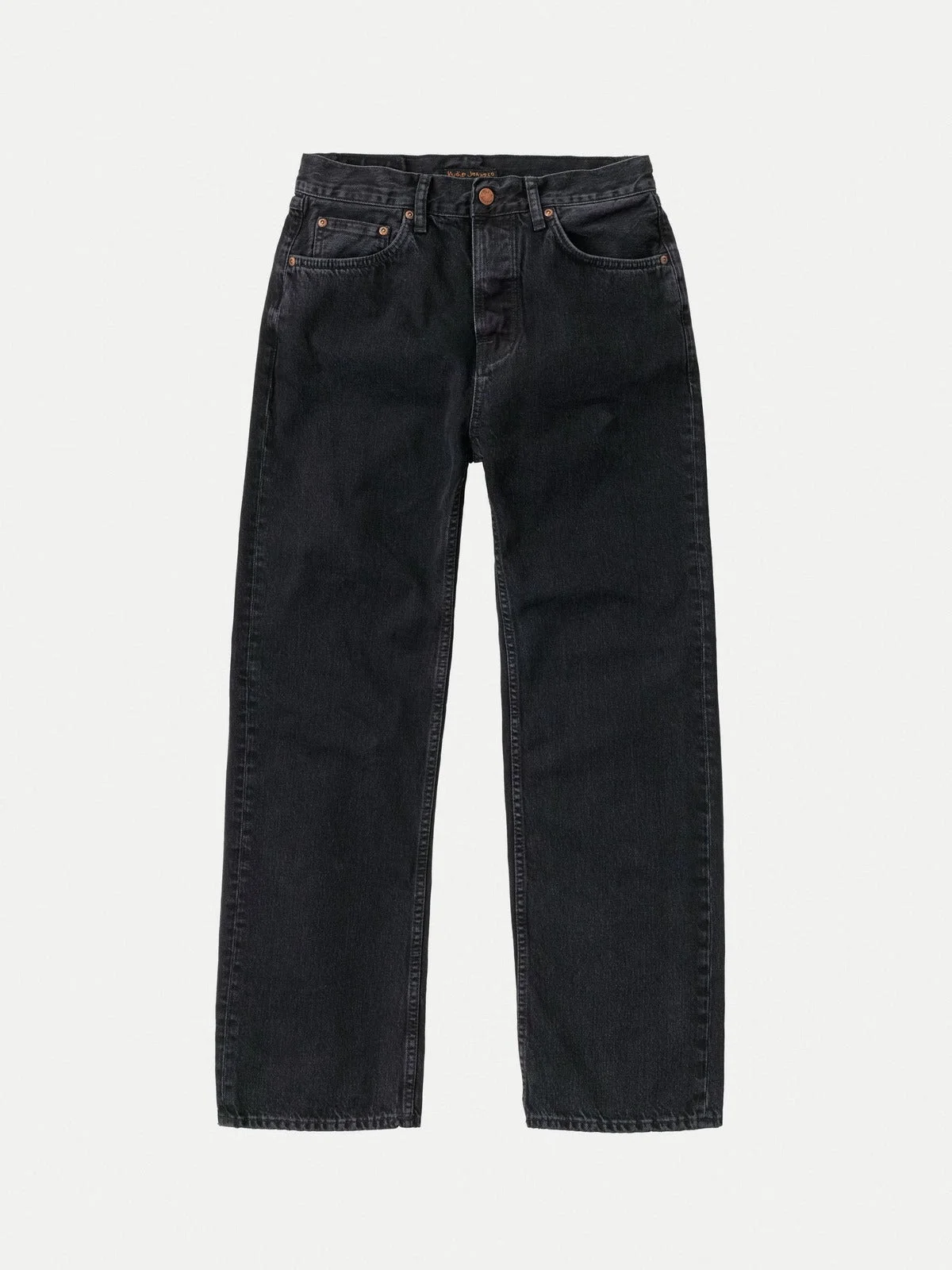 A straight-leg loose fit in a rigid black denim option with smooth stonewash. Made with organic cotton. Description. Loose-fit jeans with a straight leg made in our favorite Italian black denim. These jeans have been treated with a smooth stonewash that has revealed a muted yet rich marbling texture. Over the seams, wash effects are more pronounced, giving the jeans a beautiful depth. Dull black with muted contrast, stonewashed black denim does not get better than this. Details. - Organic cotton - 12.5oz. rigid denim - Black thread at all seams - Copper trims - Button fly - Jacron patch - Loose fit - High waist - Wide leg - Wide leg opening - 100% Cotton - Made in Tunisia Model 1 170cm 60kg Size: W28 Model 2 185 Size W32