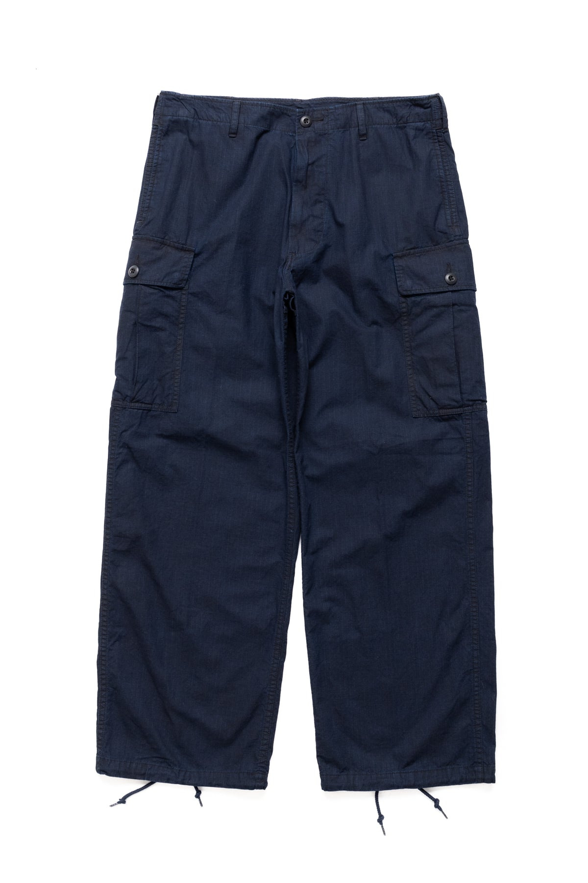 - Military pants based on the US military ripstop poplin trousers of the 1960s. - Rope dyed indigo - Indigo-dyed ripstop fabric with different shades for the base and ripstop parts. - Relaxed silhouette - The side pockets are double pockets with a smaller patch pocket inside. - The original details were used for hemostasis, but by adding a D-ring to the tip, the tape can be used as a key chain. - Color: Sumi - 100% cotton - Style #: 38-24-0104-791 - Model is 6'2 wearing a size L