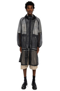 Special Engineered Garments collaboration partnered with our friend store, Nepenthes NY. The Mesh Parka is a bold new addition to the EG lineup—a translucent jacket/coat hybrid, introducing a level of sheerness not previously explored in our collections. It can be worn at its standard length or extended into a long coat by releasing the concealed interior snaps. Designed for versatility, it layers effortlessly over a T-shirt and can be worn even in the height of summer. The degree of transparency differs by color, encouraging exploration of both fabric and tone. Exceptionally breathable, the Mesh Parka is not only visually striking but also practical—ideal for warm climates, outdoor gatherings, or mosquito-prone environments where coverage and airflow are equally essential - Polyester mesh - Color: Black - Made in USA - Model is 6'2 wearing a size M