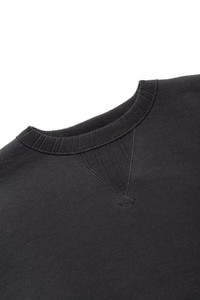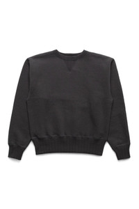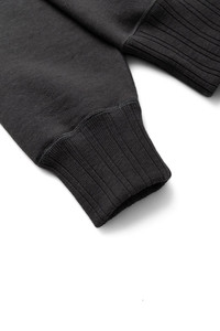 The loopwheel sweatshirt, now only produced in Wakayama Prefecture, Japan, using machines that are still in existence, is made with an inefficient process that yields only about 10 meters of fabric per day, just like the American sweatshirts of the 1940s and 50s. However, its greatest appeal lies in its soft texture and superior comfort. This luxurious loopwheel sweatshirt is made from pre-dyed Zimbabwean cotton (brown cotton). This process allows you to directly enjoy the natural feel of the raw cotton fibers. The garment is constructed using flatlock stitching with a Union Special sewing machine. The ribbing uses a random needle-out technique. The gusset is a double V-insert design. The neck ribbing is sewn with a double-needle sewing machine, resulting in a meticulously crafted sweatshirt with numerous thoughtful details. - Color: Ink Black - 100% cotton - Made in Japan - Model is 6'2 wearing a size 40