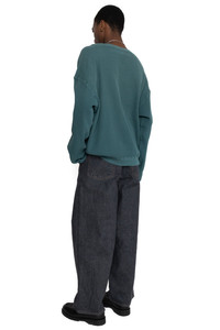 - 14oz denim baggy pants using black warp and ecru weft. - In addition to the regular hip pockets, the back has a single beaded pocket with a button. - One wash - 100% cotton - Any tears or damage caused by processing are intentional in the design and are not product defects. - Made in Japan - Style #: K2309LP032 - Model is 6'2 wearing a size 2